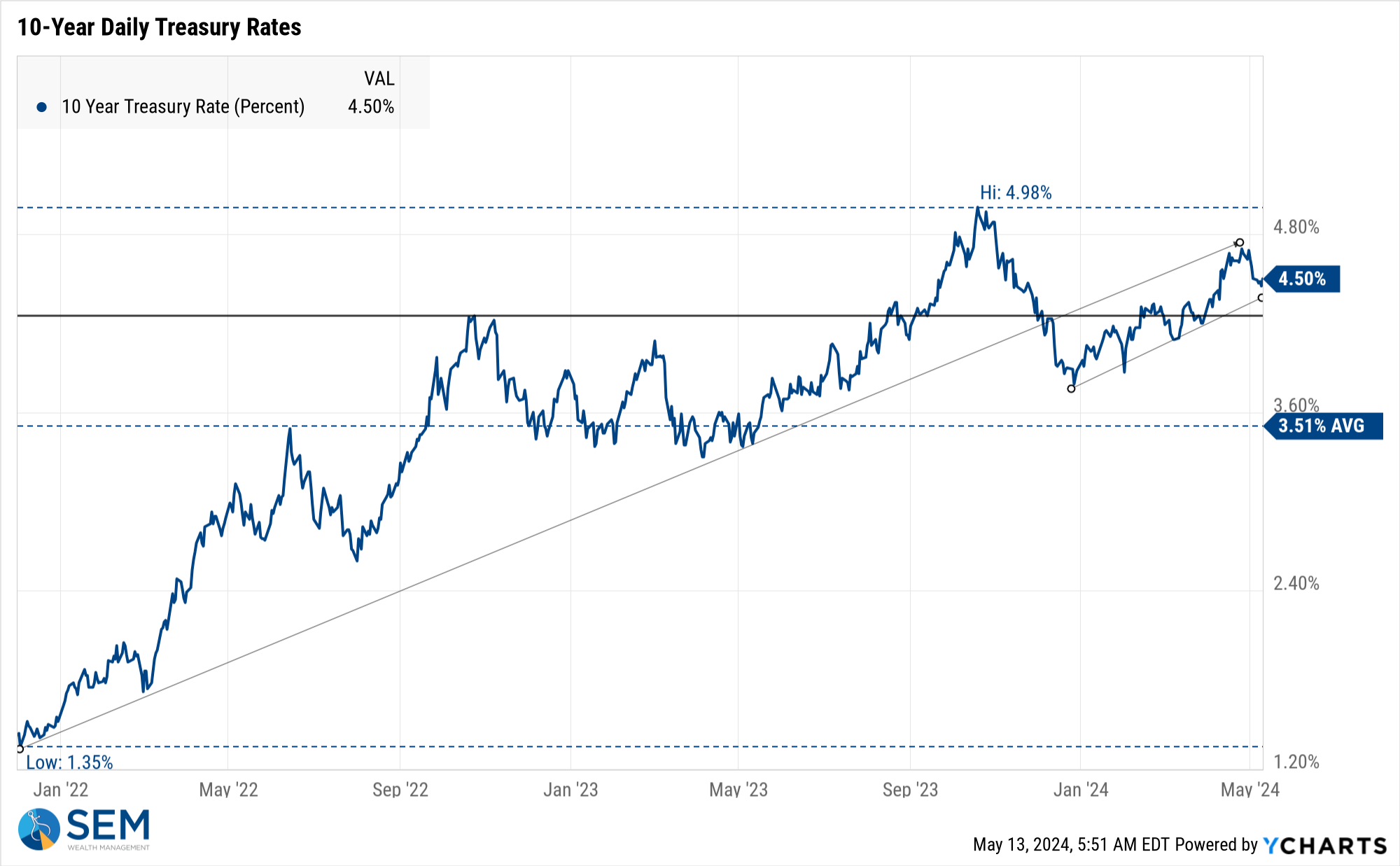 Like stocks, bonds had a nice, steady week. The trend in yields is still higher, which should be a problem for stocks.