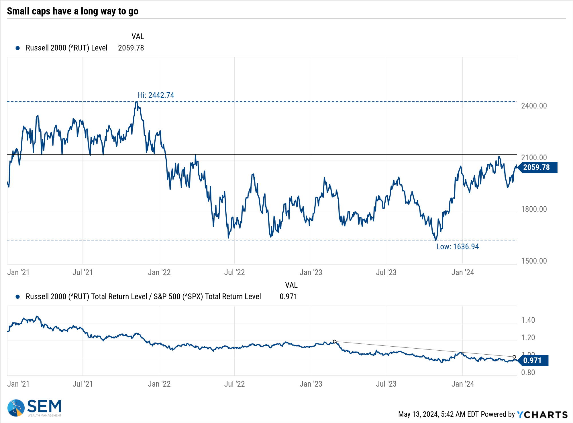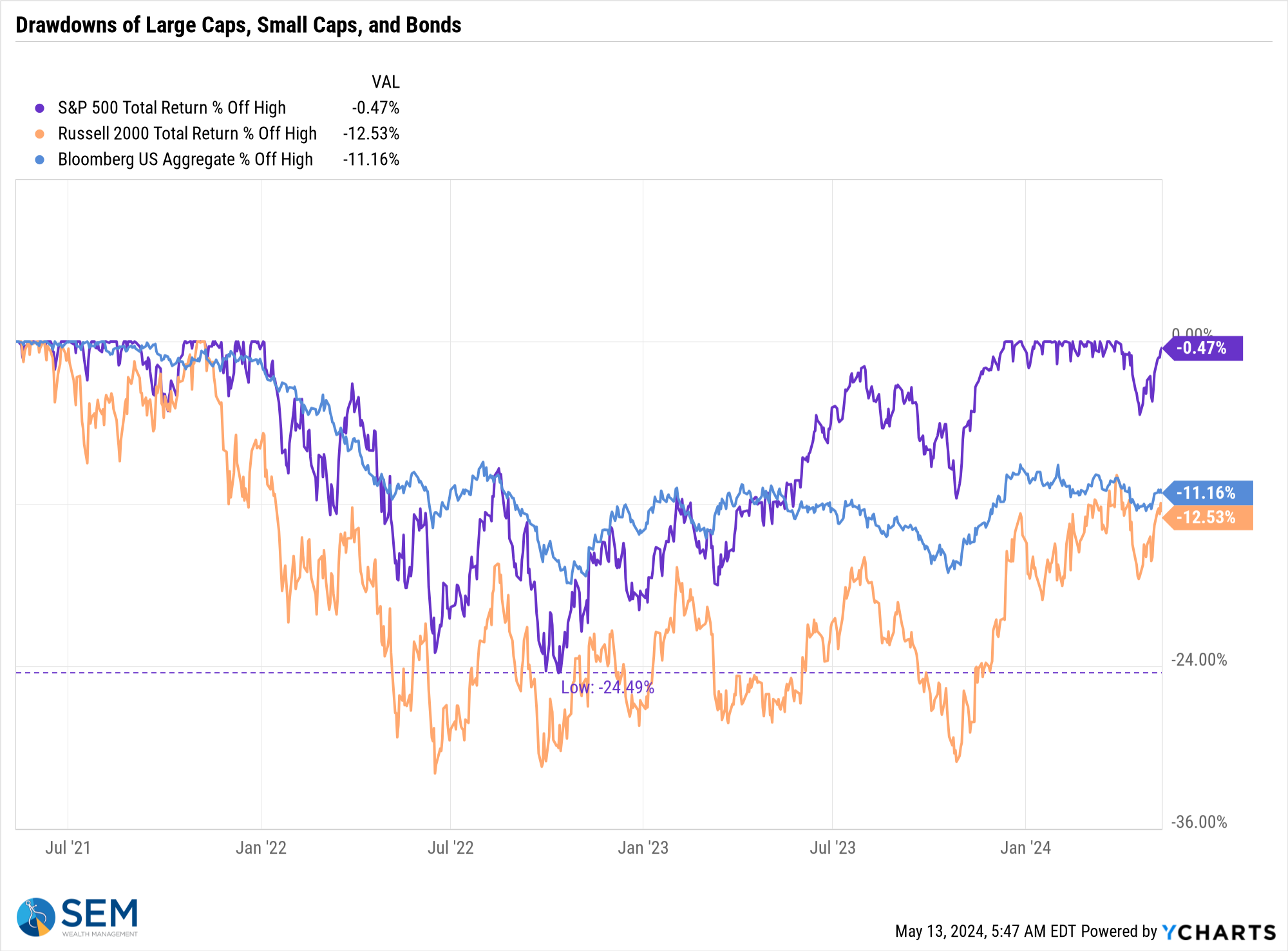 Looking at the drawdowns (% down from the high), you can see the difference between large (mega) caps, small caps and bonds. Diversification has hurt during the post-pandemic "boom".