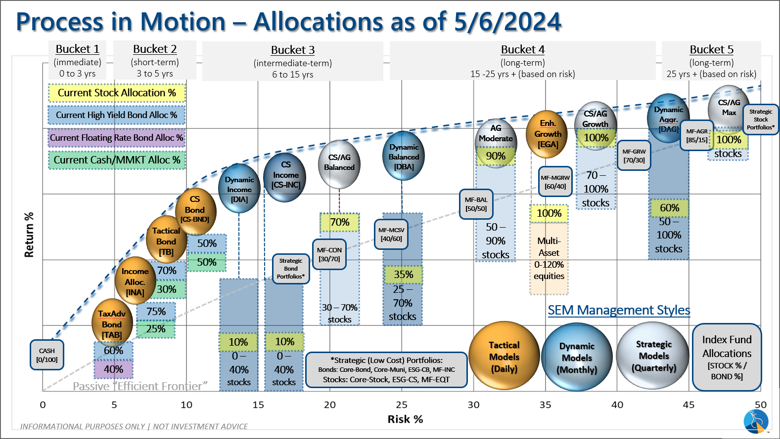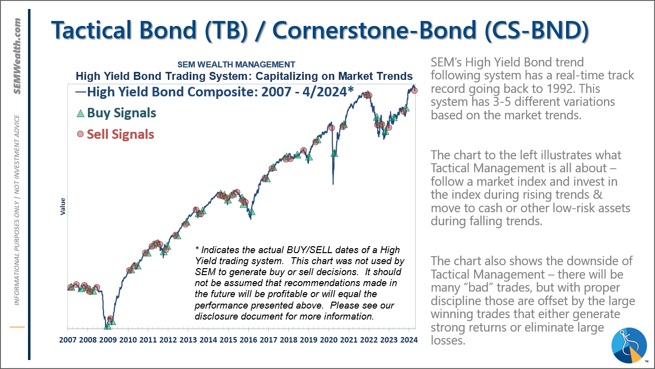 Tactical (daily): On 5/6/24 about half of the signals in our high yield models switched to a buy. The other half remains in money market funds. The money market funds we are currently invested in are yielding between 4.8-5.3% annually.