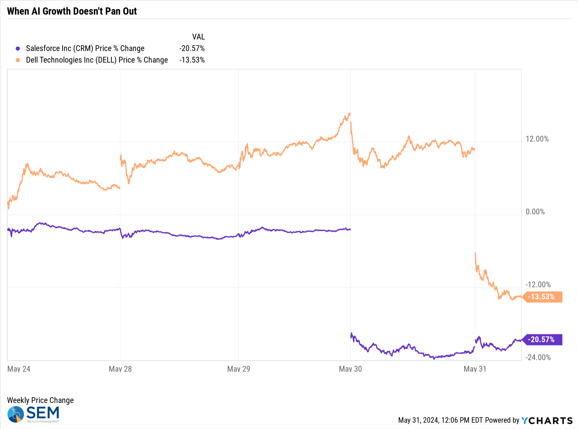 Another example was Dell Technologies, who this year has goosed their stock by focusing on their AI-related server business. Growth was certainly strong last quarter, but nowhere near the expectations the market had. The stock was up 12% for the week going into the earnings report. It quickly lost 25% as expectations were adjusted. The realization is these servers are expensive and not every company can afford to purchase them at the rate everyone was expecting.
