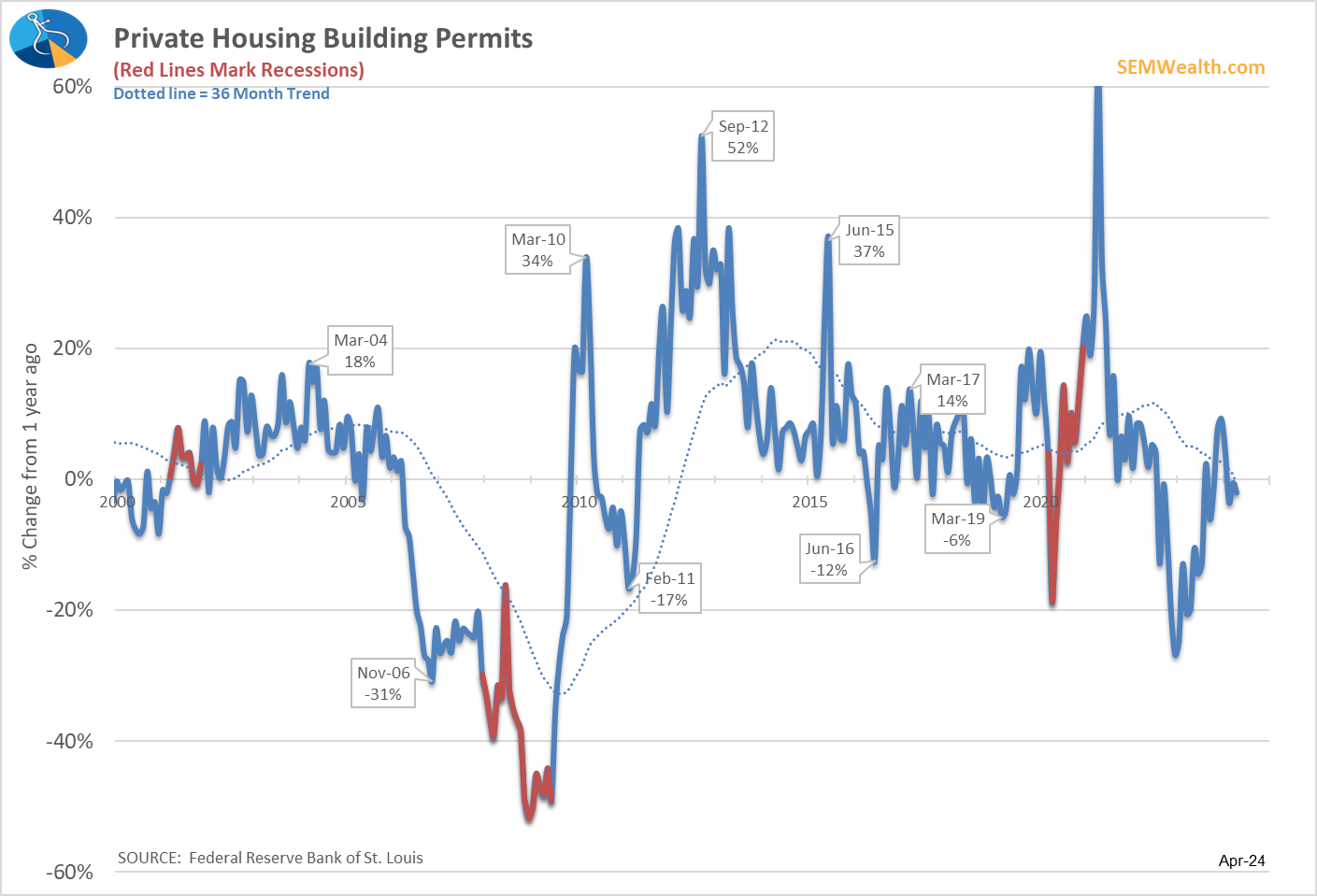 While a good sign for those hoping to buy a home, the housing market has slowed markedly. Building permits are declining over the past year.