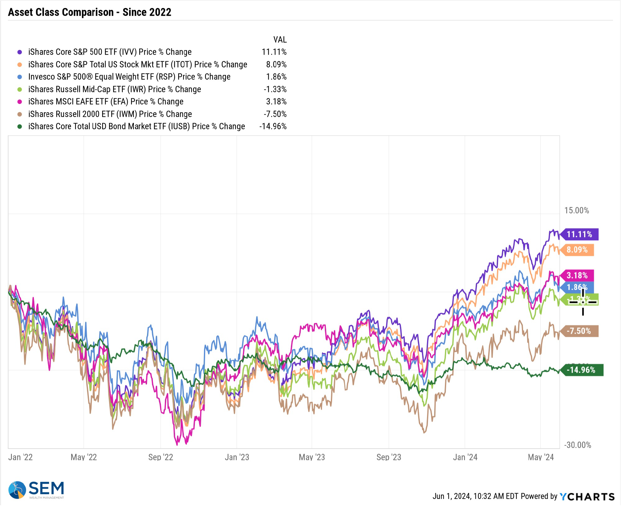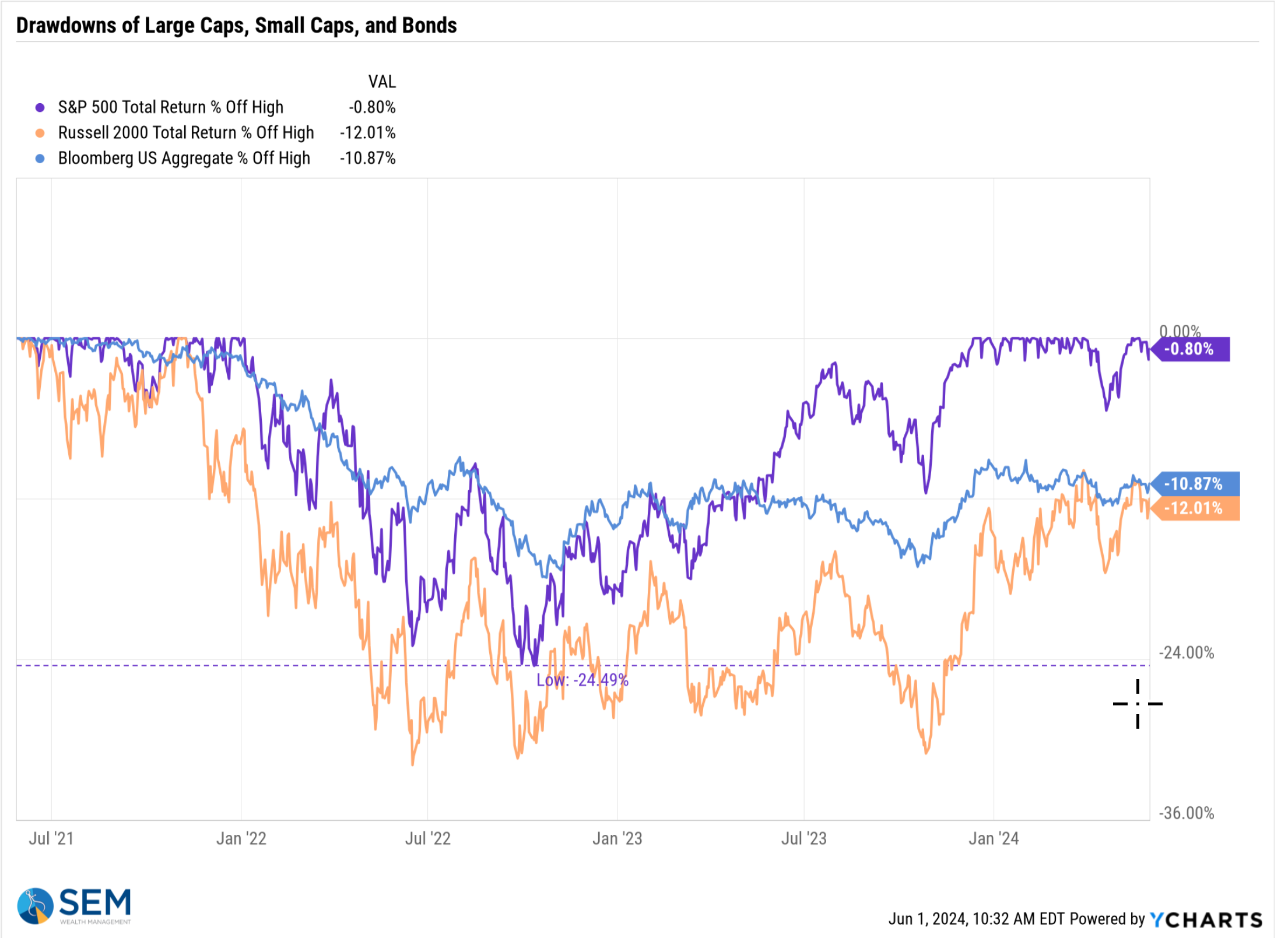 Any sort of diversification continues to be a drag on performance. History tells us this is not normal and some sort of correction needs to occur – either large cap stock values are reset at a lower price or small caps and bonds play catch-up.