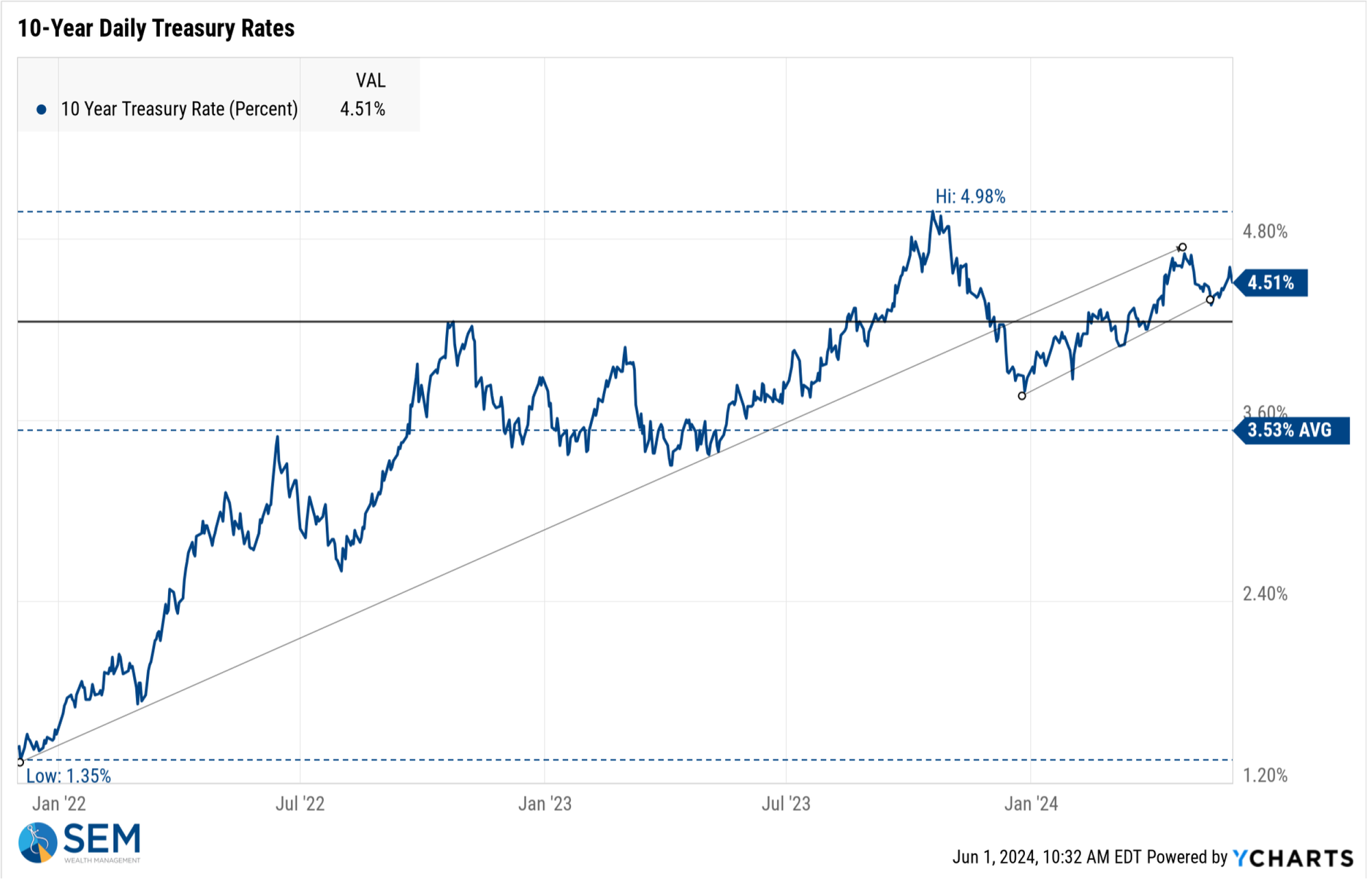 Interest rates remain in their upward rising channel, which should not be good news for stocks (or the economy).