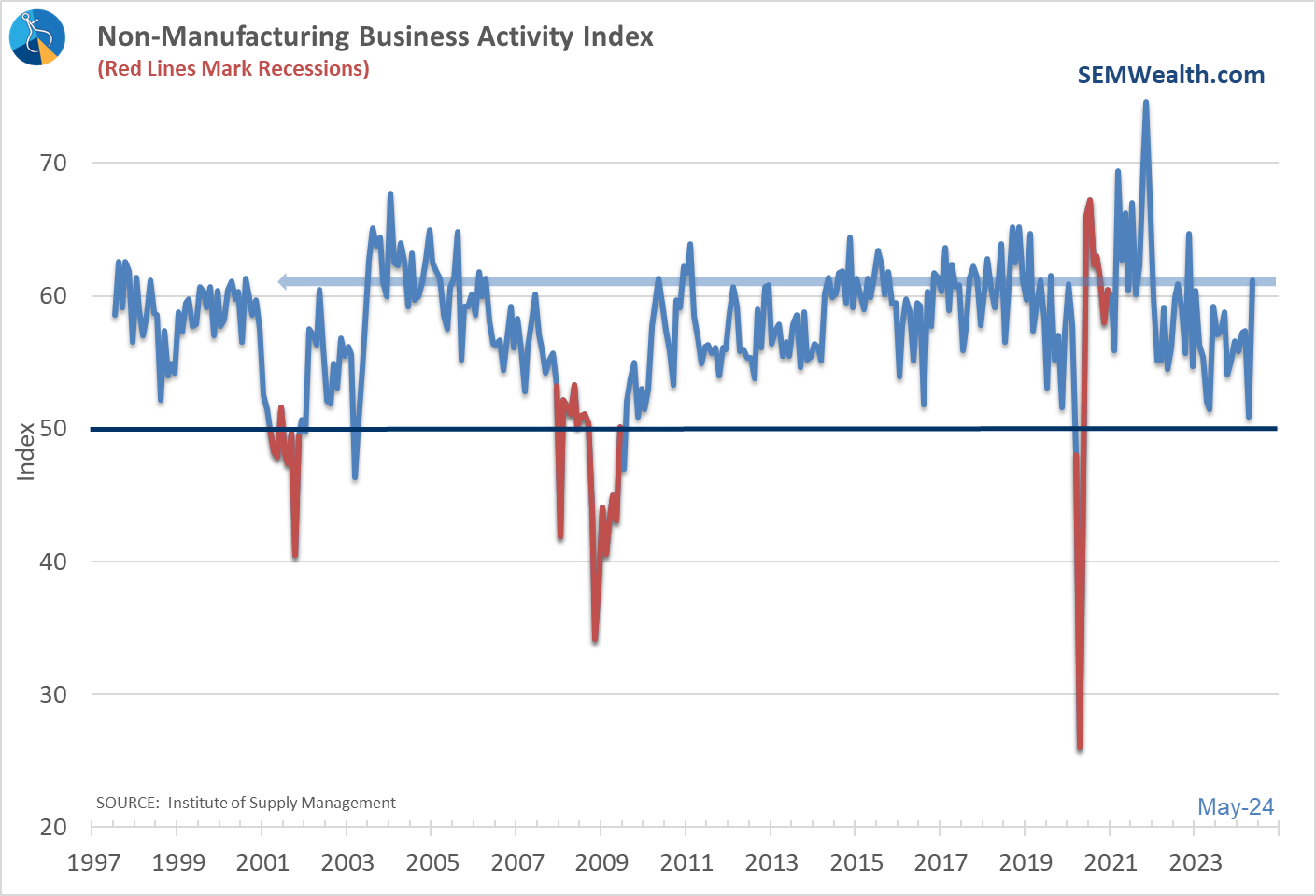 While we are not a manufacturing economy any more, the activity in this sector remains a key leading indicator as increased activity here is a sign of a strong underlying economy. Anything below 50 for these indicators is a sign of contraction in the economy.