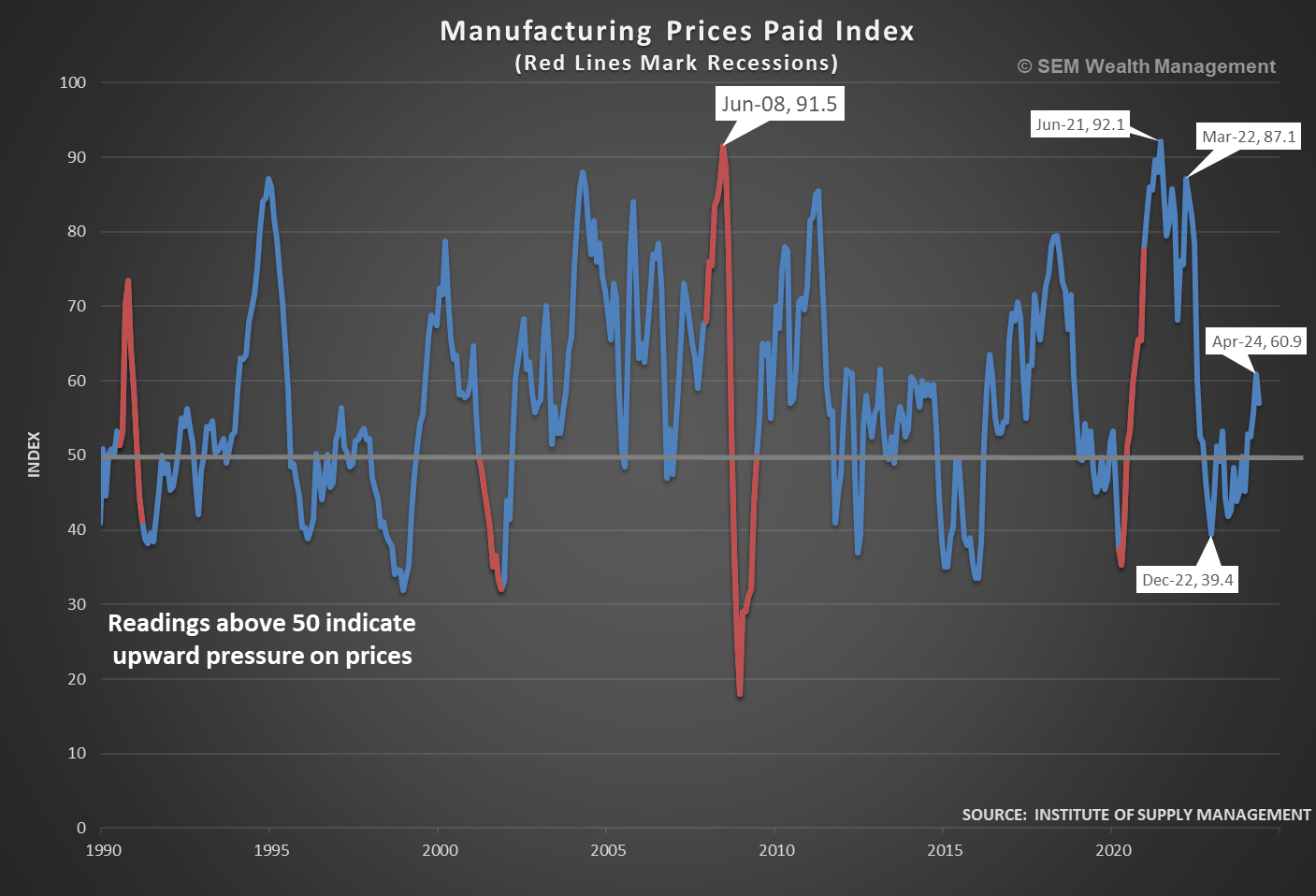 This is the problem the Fed faces – there is upward pressure on prices that could make it difficult to cut rates before the economy slows too quickly.
