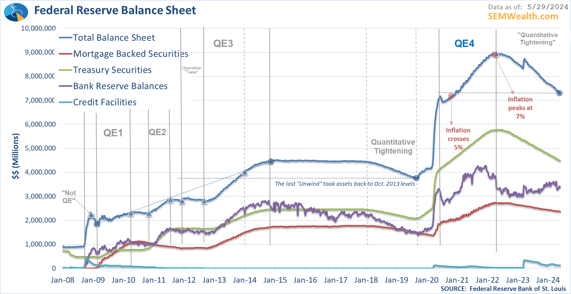 SEM's economic model uses a measure of Money Supply called M-Prime. This adjusts the traditional "M2" used by most economists and accounts for inflation and most importantly BROKERAGE (non-bank) money market accounts. We all know these accounts are basically cash equivalents in today's electronically connected world, so it's important to see what is happening with ALL CASH, not just that at the banks.