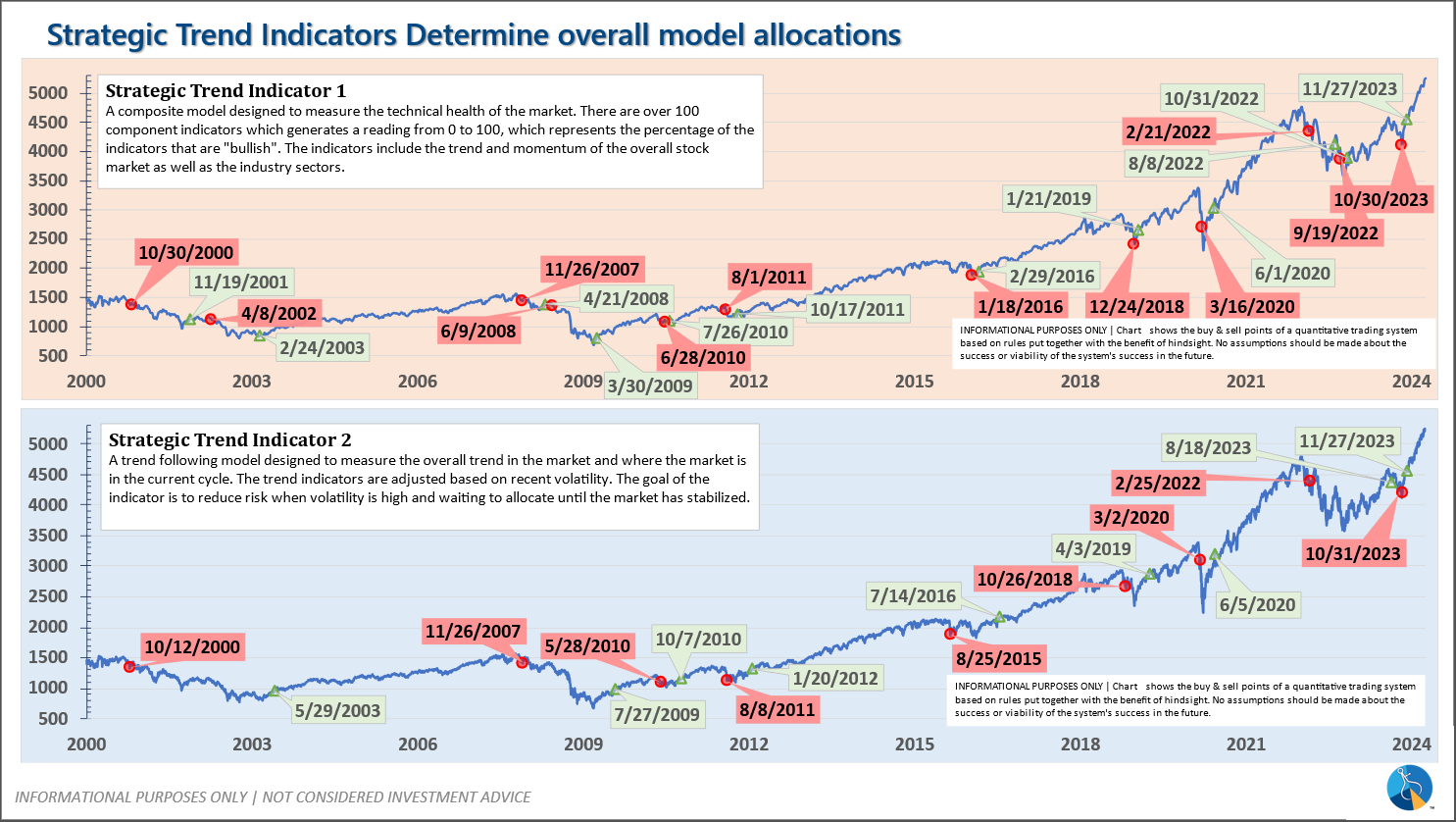 The * in quarterly is for the trend models. These models are watched daily but they trade infrequently based on readings of where each believe we are in the cycle. The trend systems can be susceptible to "whipsaws" as we saw with the recent sell and buy signals at the end of October and November. The goal of the systems is to miss major downturns in the market. Risks are high when the market has been stampeding higher as it has for most of 2023. This means sometimes selling too soon. As we saw with the recent trade, the systems can quickly reverse if they are wrong.