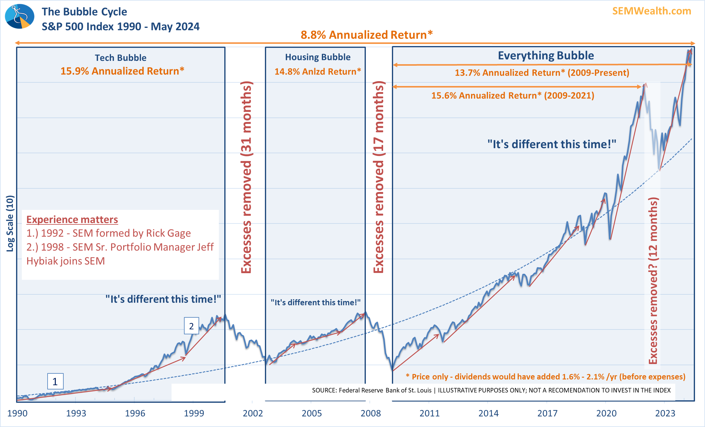 One thing I forgot to include was my favorite chart which highlights the cycles we've seen since 1990. The long-term return for stocks is around 9-10% going all the way back to the 1900s. Remember how averages work – the more time you spend well above average means the more time you need to spend below average.