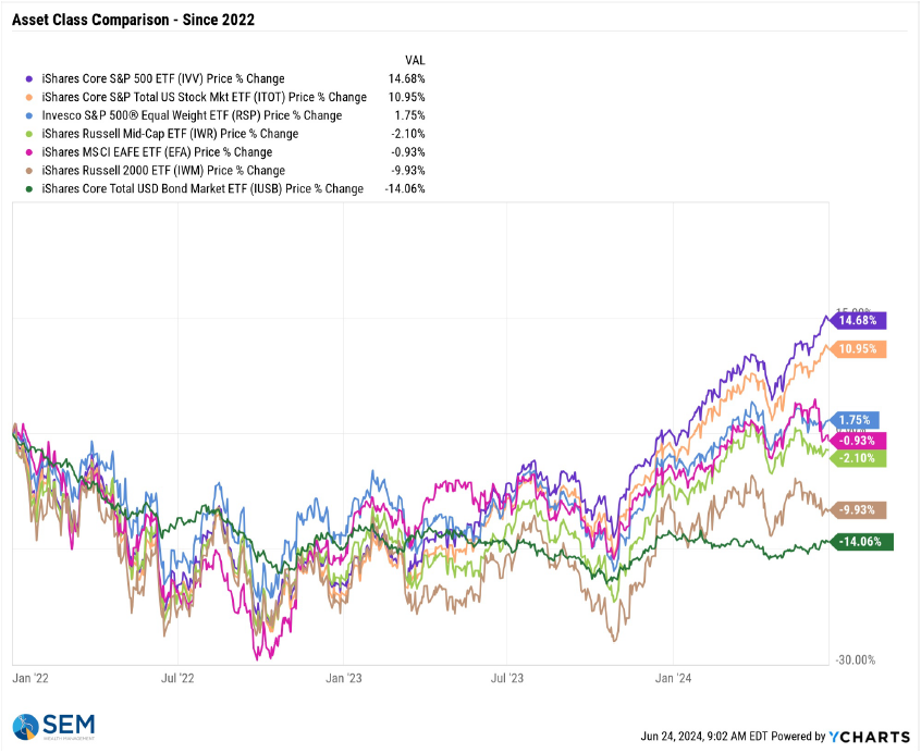 It was another bad week for those who believe the market is going to broaden out. Large caps were up for the week and small caps were down. Value slightly out-performed growth on the week. As we continue to say, higher-highs tend to breed higher highs......until something causes a structural shift. While we cannot identify what that shift will be, it is easy to imagine (based on experience and history) it being the inability for the projected AI hype to lead to actual bottom line profits. It is impossible for the largest companies to grow as quickly as the market is projecting over the long-term, when the market realizes this the valuation adjustment could be severe.