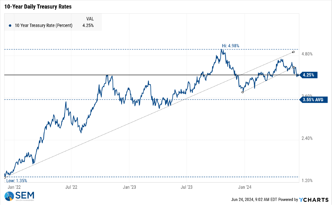 Interest rates are trying to move lower, which gave bonds a nice lift last week. It is still too soon to call the end of rising rates.