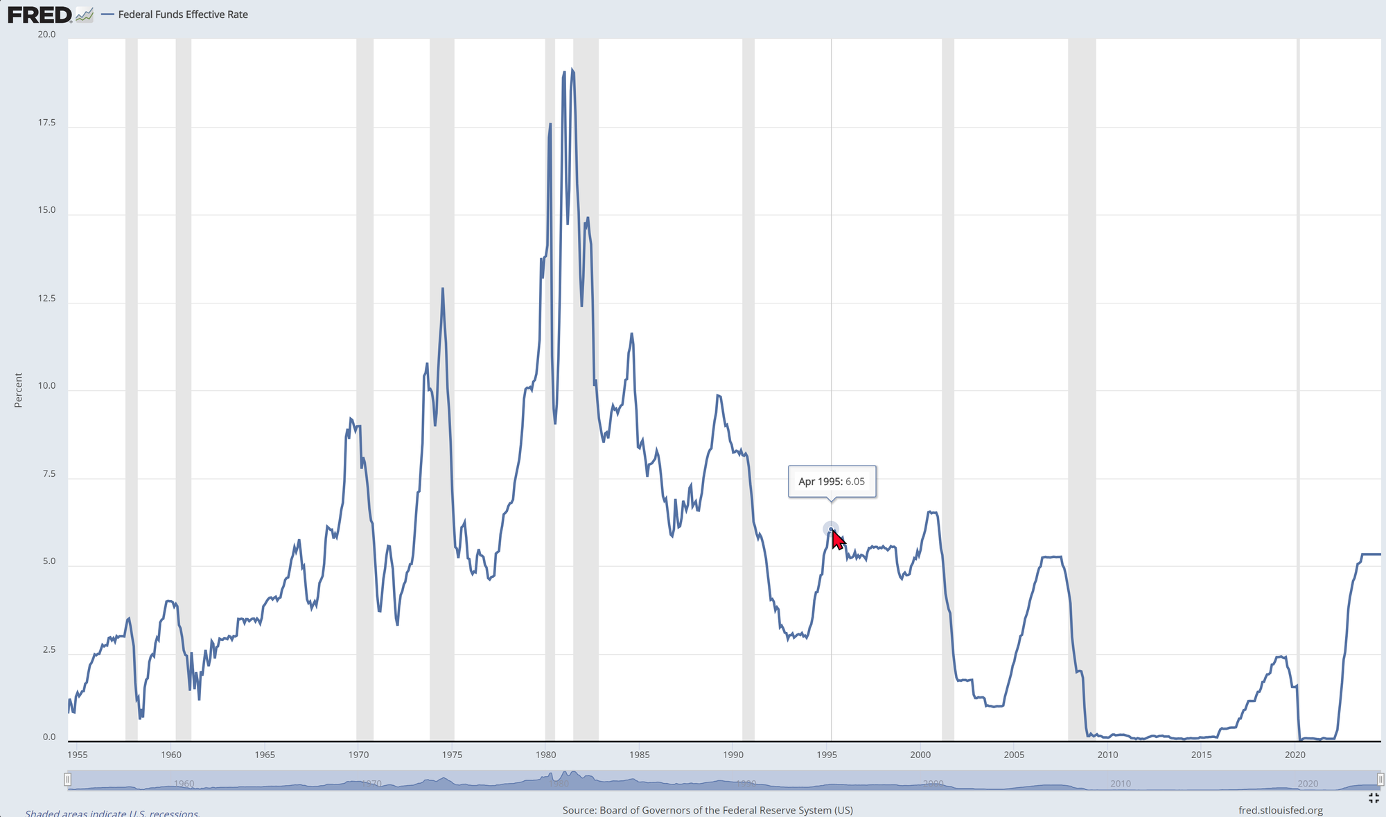 This chart shows the Fed Funds rate (the interest rate the Fed controls). The grey bars are recessions – not how many times rate cuts came just before our during a recession and how few times they were cutting rates when we didn't have a recession.