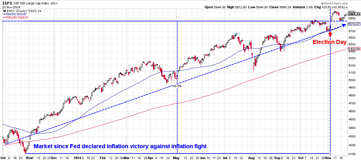Ever since the Fed declared victory over their inflation fight, the market has already been rallying – up 42% since the end of October 2023.