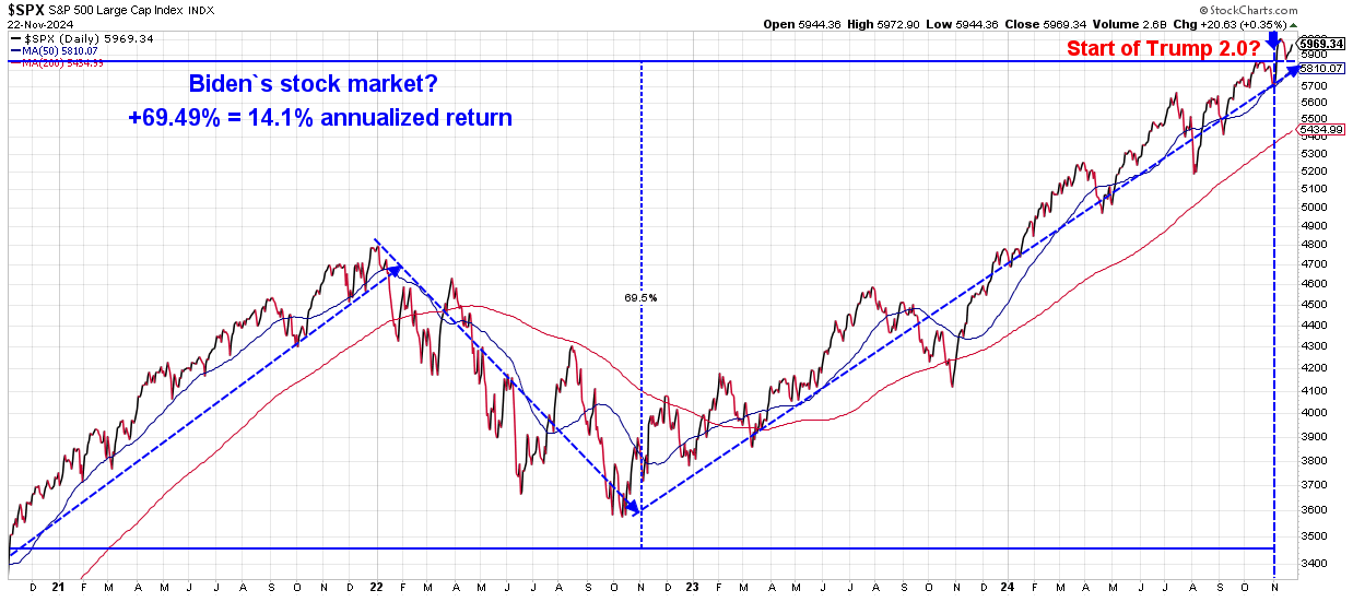 Let's start with President Trump's new benchmark – November 6 – I cannot give him November 5 because going into the election it was literally a coin toss on who would win. Since the close on election night the market did stage an impressive rally. Some of that enthusiasm waned in week 2, but resumed again last week. I kept the blue trend lines and the mark for the "Biden" all time highs on this chart as a point of reference.