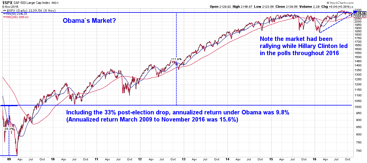 Back in 2008 I coined a phrase, "Do not let your political opinions influence your investment decisions." I did this because we had a flood of clients and advisors with some dire predictions following the election of President Obama. This of course was based on some pretty extreme campaign talking points fueling an anti-Wall Street populist movement. These clients and advisors wanted to go all to cash after his election.