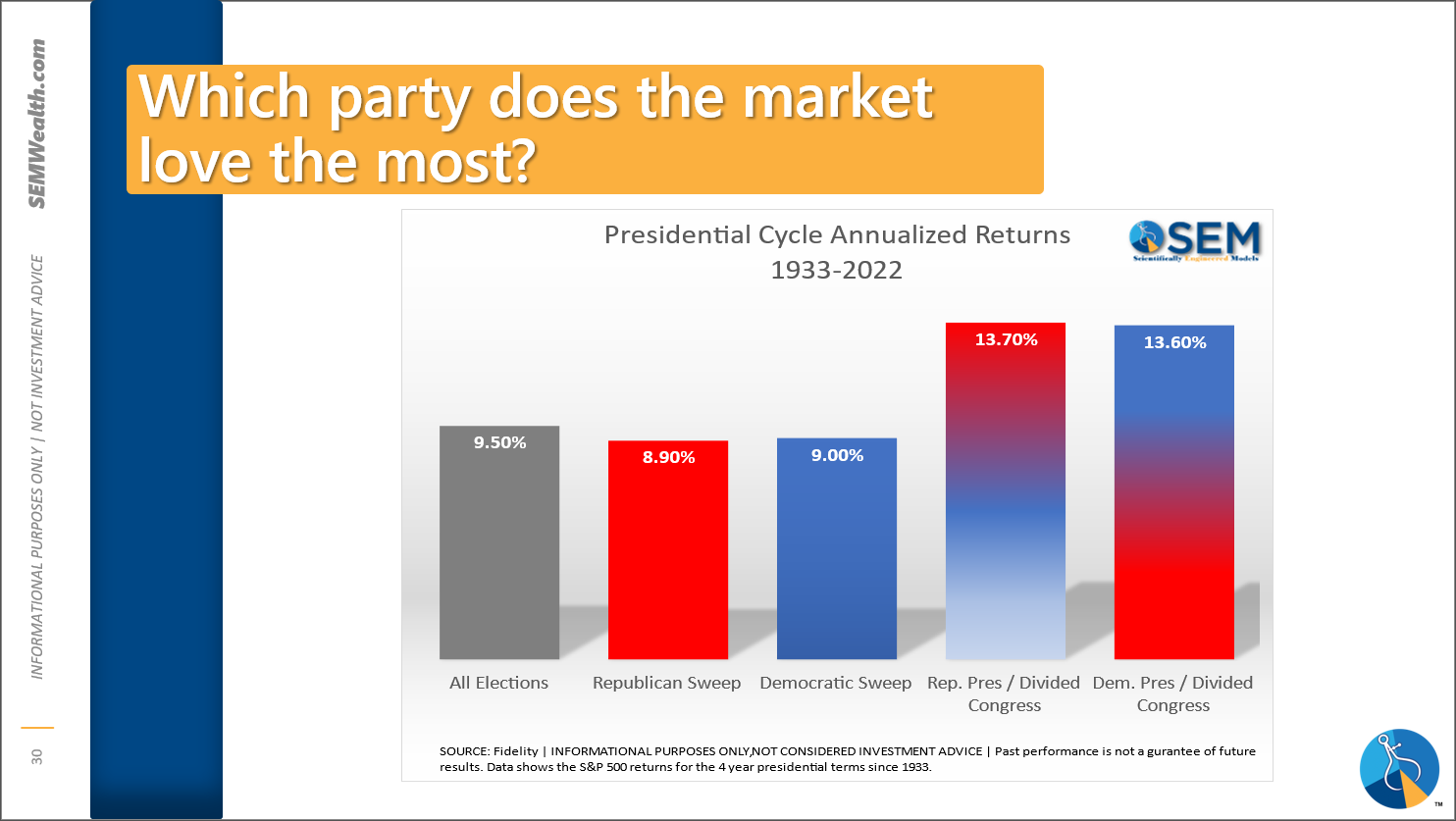 I'm not saying any of this to dampen your enthusiasm (or to make light of your concerns) about the future based on the election outcome. I do want everyone who is an SEM client or advisor that SEM's systems are designed to remove all emotion and to make decisions based on the data. Each portfolio is customized around the financial plan, cash flow strategy, and risk personality of each client. Those things should not change based on who is in the White House.