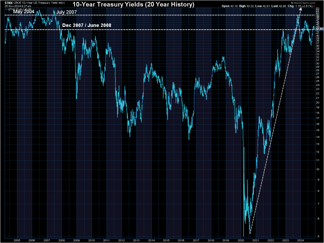 I'm going to show a slightly different, longer-term interest rate chart this week to keep this big up move in perspective. Yes interest rates have spiked quite a bit, but we are simply back to the range we saw from 2004-2007.