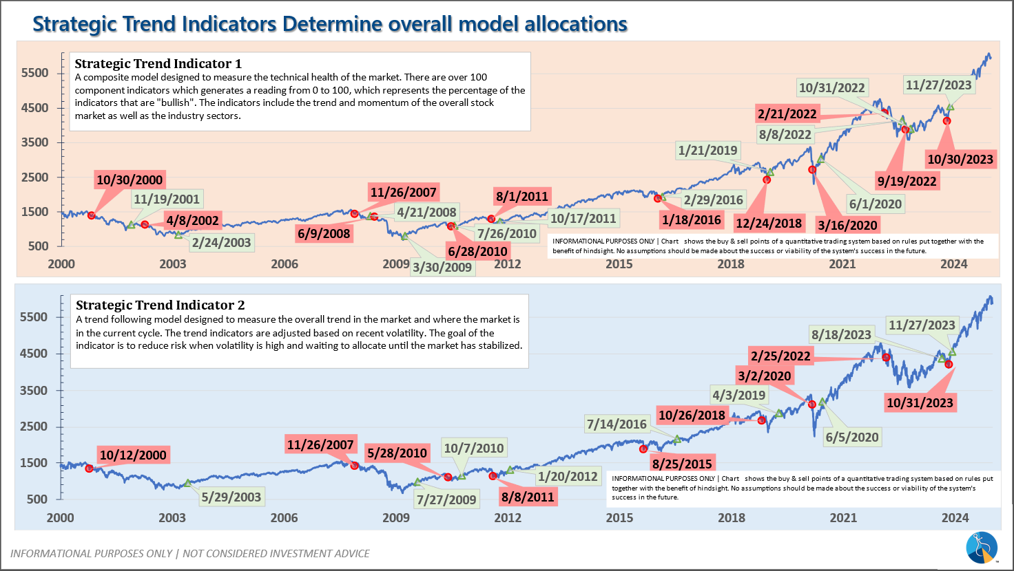 The * in quarterly is for the trend models. These models are watched daily but they trade infrequently based on readings of where each believe we are in the cycle. The trend systems can be susceptible to "whipsaws" as we saw with the recent sell and buy signals at the end of October and November. The goal of the systems is to miss major downturns in the market. Risks are high when the market has been stampeding higher as it has for most of 2023. This means sometimes selling too soon. As we saw with the recent trade, the systems can quickly reverse if they are wrong.