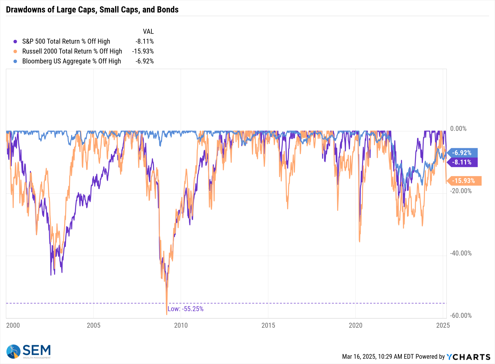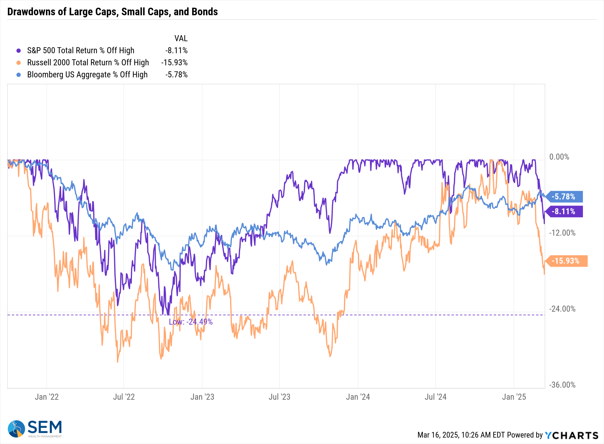 This next chart shows the "drawdown", which is the percentage drop from the highs. Note how again the S&P 500 (the purple line) has outperformed small caps (the orange line) in a big way.