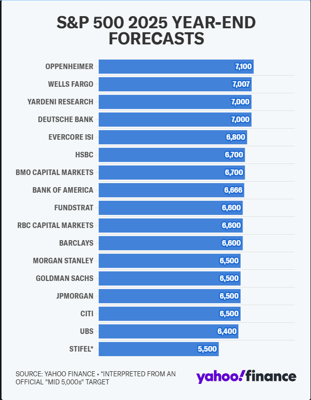 The S&P 500 started the year at 5800. After back-to-back 20%+ rallies, Wall Street expected at a minimum an "average" year of 10% growth, with Oppenheimer, Wells Fargo, Yardeni Research, and Deutsche Bank expecting 20% gains for stocks. Only Stiefel predicted a small decline.