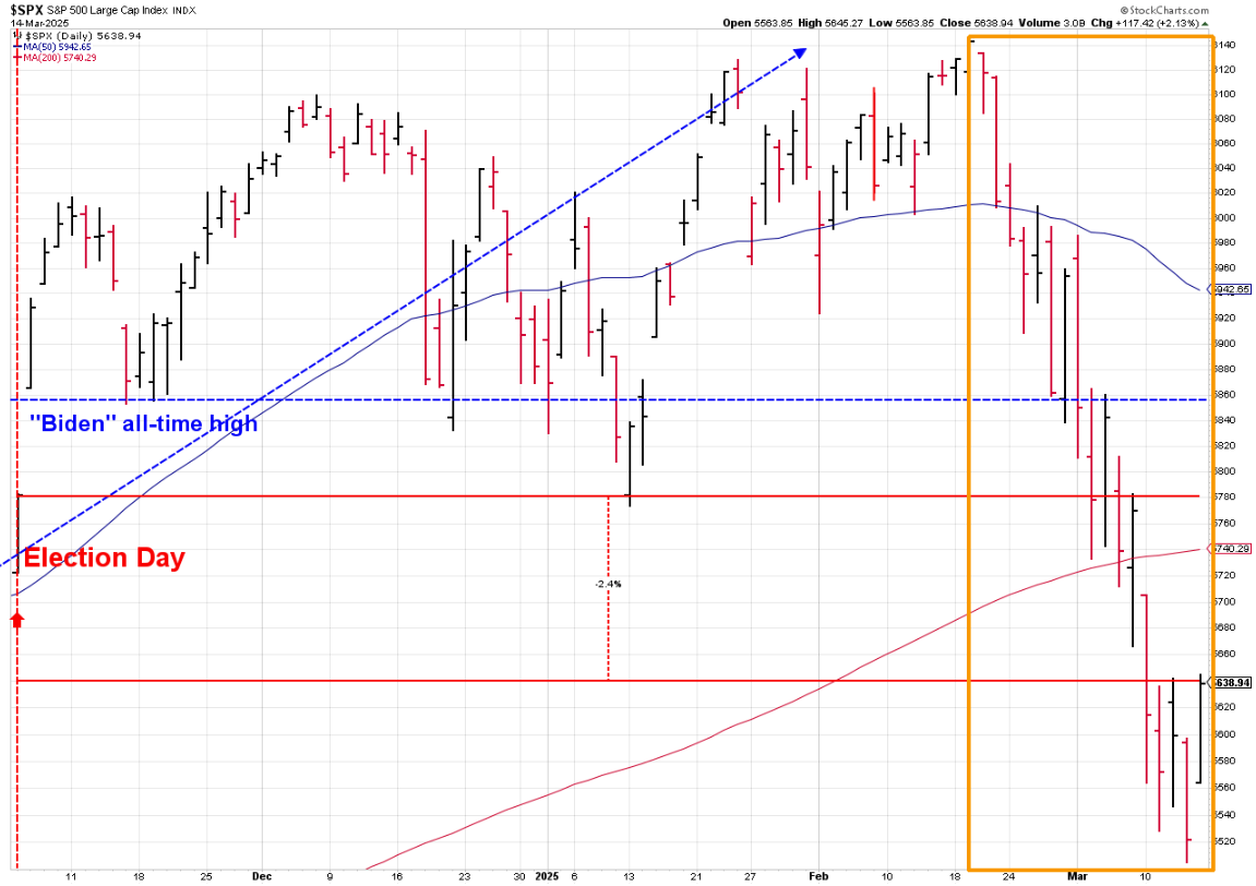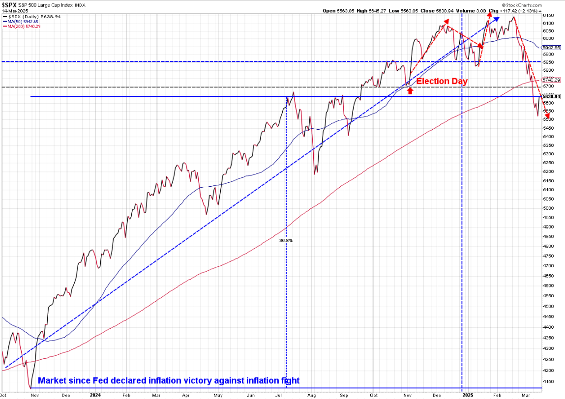 I've also been showing this chart each week, which is much more important for perspective. The "Trump rally" actually started way before he was the clear winner. It started when the Fed announced they were ending their inflation fight in late 2023. For perspective, even after the 10% correction in stocks, the S&P 500 is still up nearly 37% since October 2023!