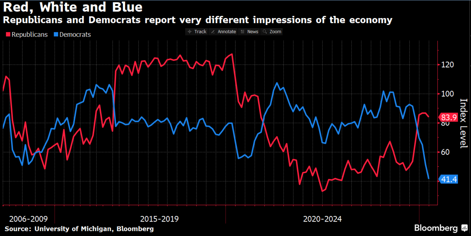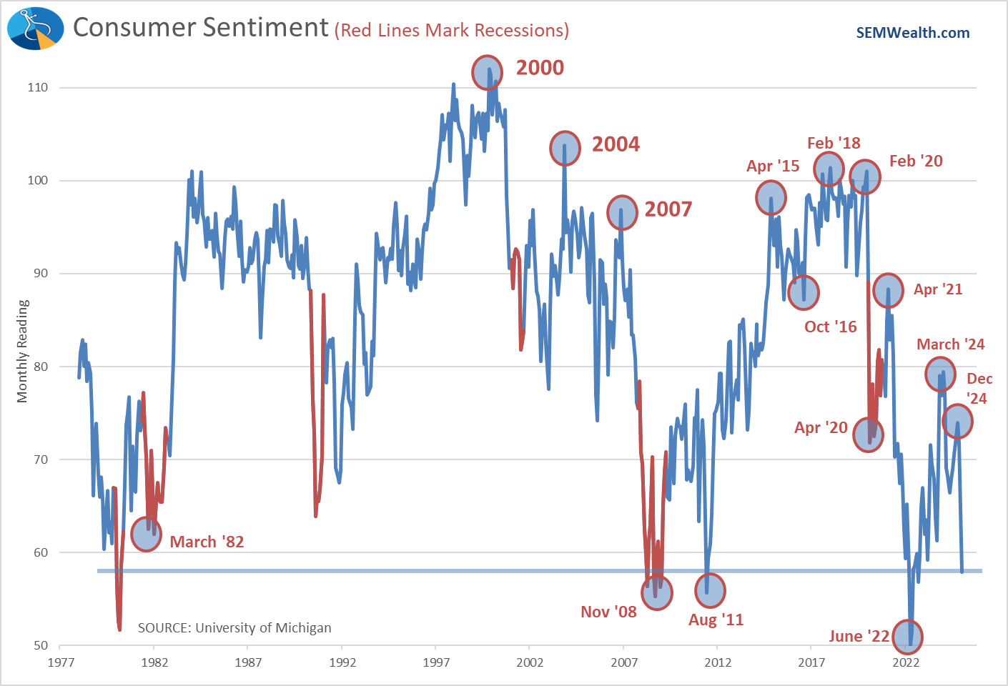 Keep in mind, at last count 42% of Americans were independent, so the two fringes above only represent about 30% of Americans on each side. A pessimistic consumer is not necessarily a predictor of a recession as the market and economy actually bottomed several months after the prior extreme readings in 1982, 2008, 2011, & 2022. It will be interesting if the President is able to continue focusing on the policies he believes are most important even if it means a recession.