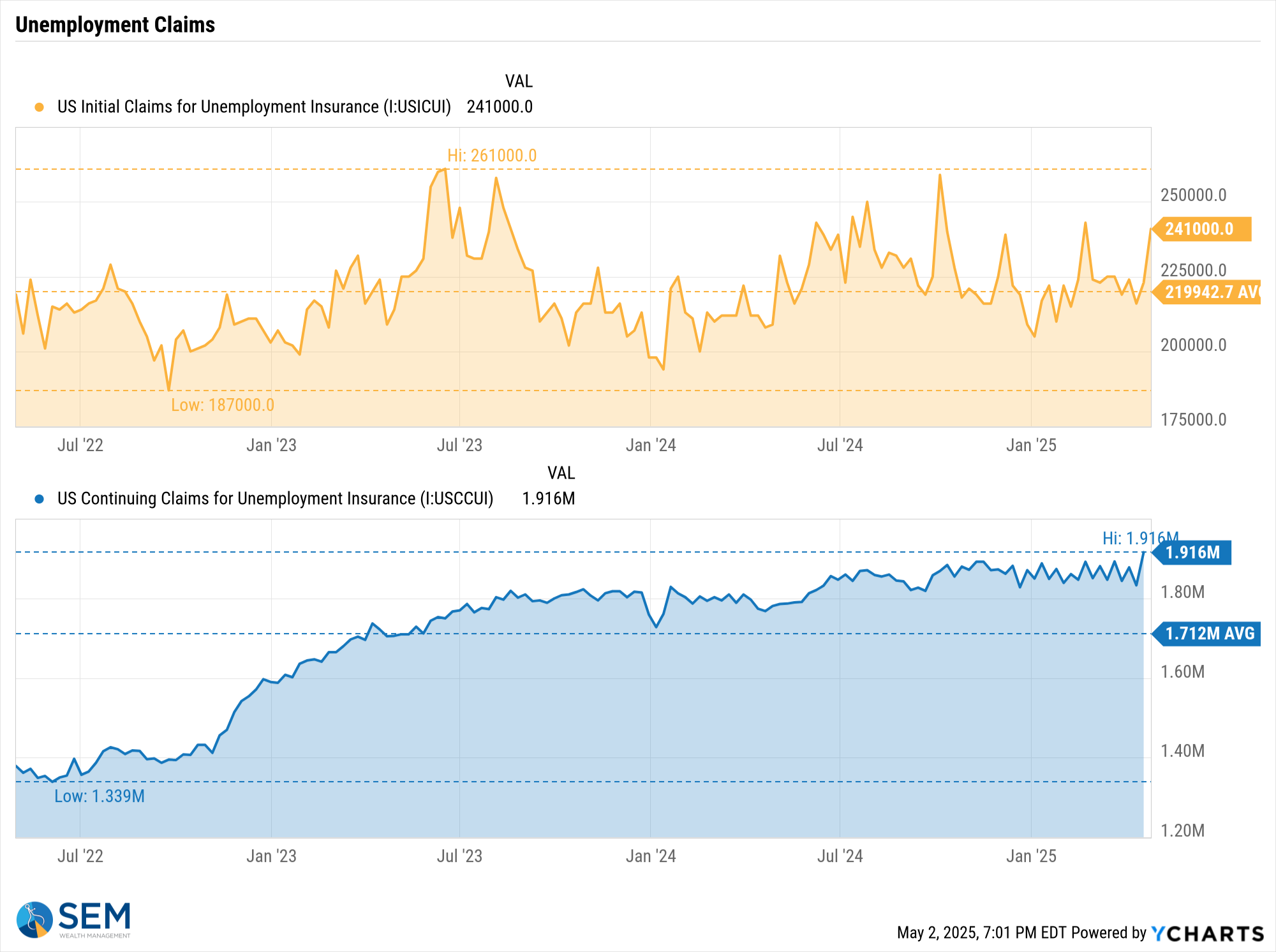 The indicator I'm watching most closely is Jobless Claims. I like this release because it comes out every Thursday using data compiled from the states. This gives us a much more clear picture of early signs of weakness in the labor market. Last week claims spiked a bit, but the weekly data can be noisy. Continuing claims remain a concern as they sit at their recent highs. This is an indication that while we may not be seeing widespread layoffs occurring, if you do lose your job you may have a hard time finding a new one.
