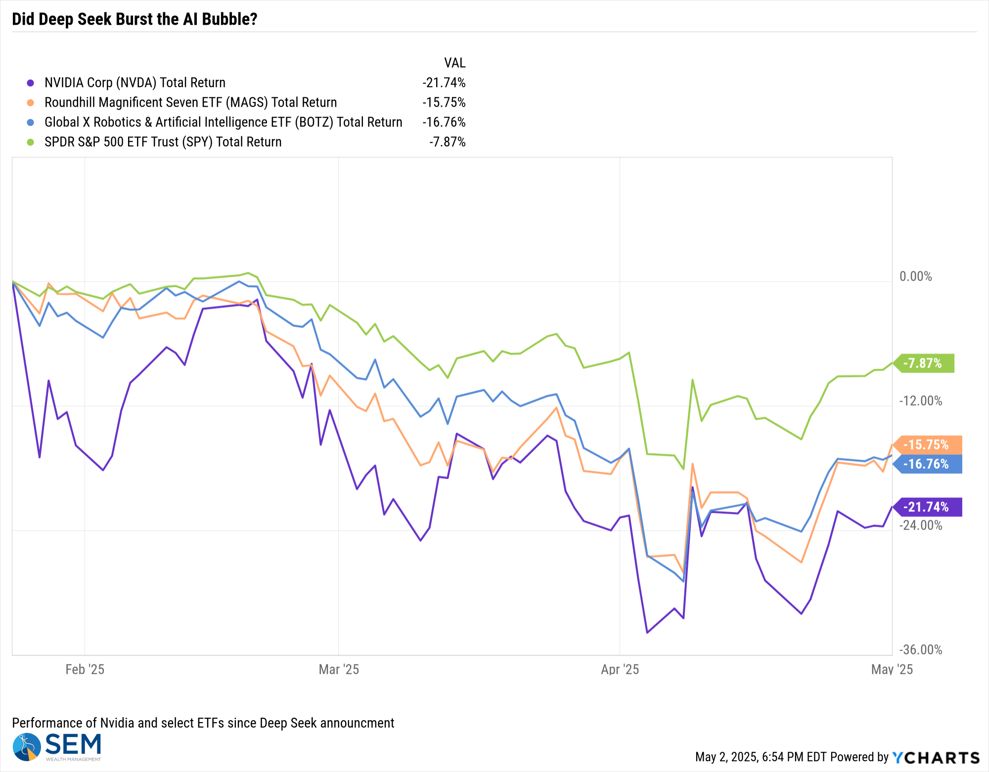 Zooming in on tech, despite a good week the prior week, Nvidia is still suffering from the Deep Seek announcement as is the rest of the AI space, which has left the so-called Magnificent Seven among the worst performers of the year.