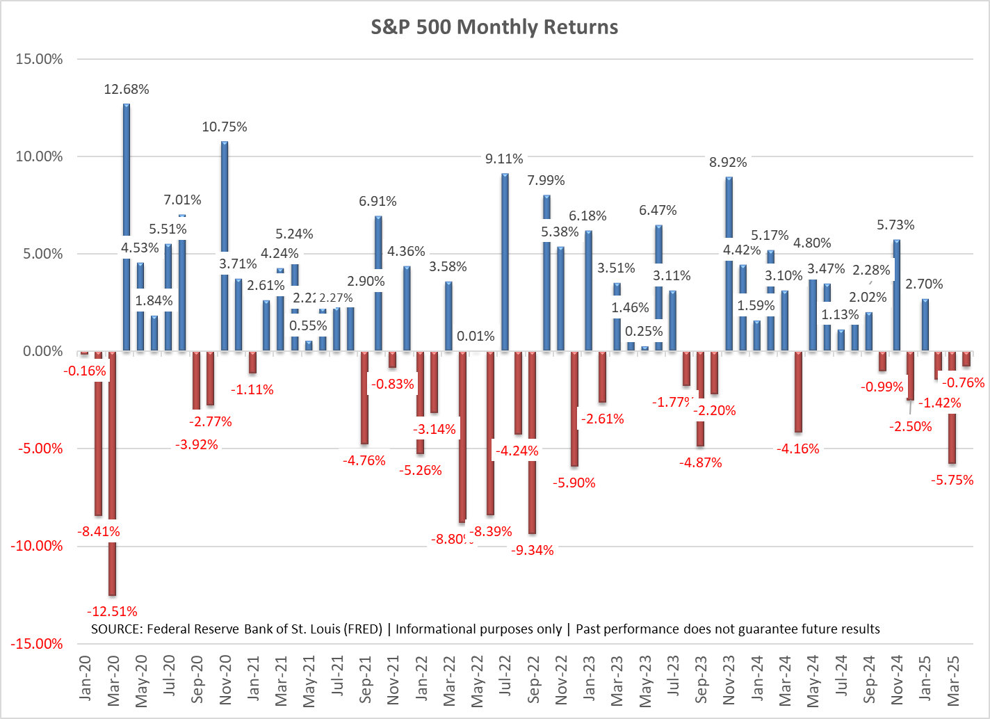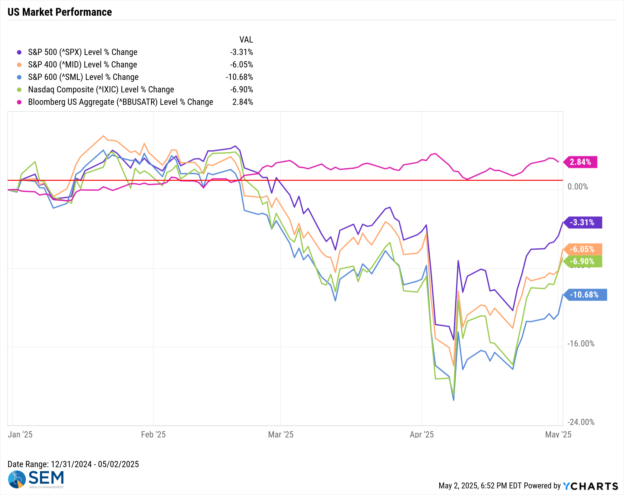Then in mid-February, with the primary focus from the White House being on tariffs and not the other policies, the narrative shifted. Inflation was not coming down and in fact could rise. The threat of tariffs meant consideration of a decline in profit margins, revenue, and earnings. The "Liberation Day" announcement on April 2 was far more dire than most had anticipated. The fact the President and Treasury Secretary did not seem to care about the market impact only created more fear.