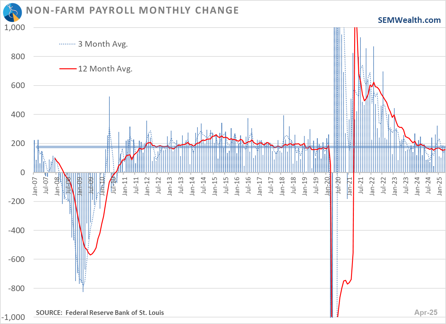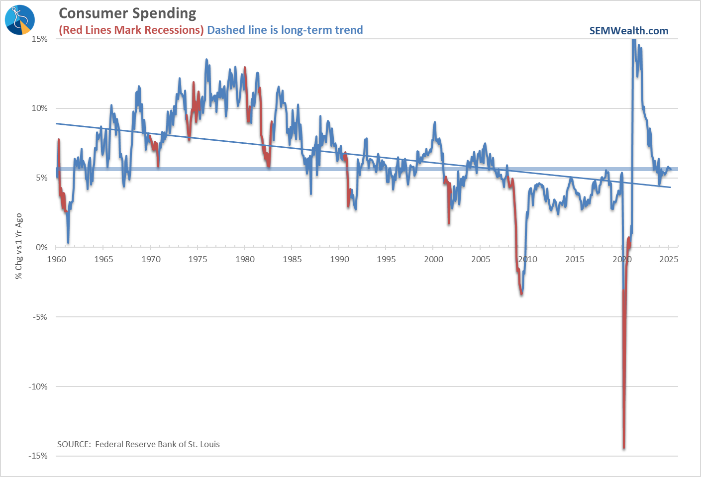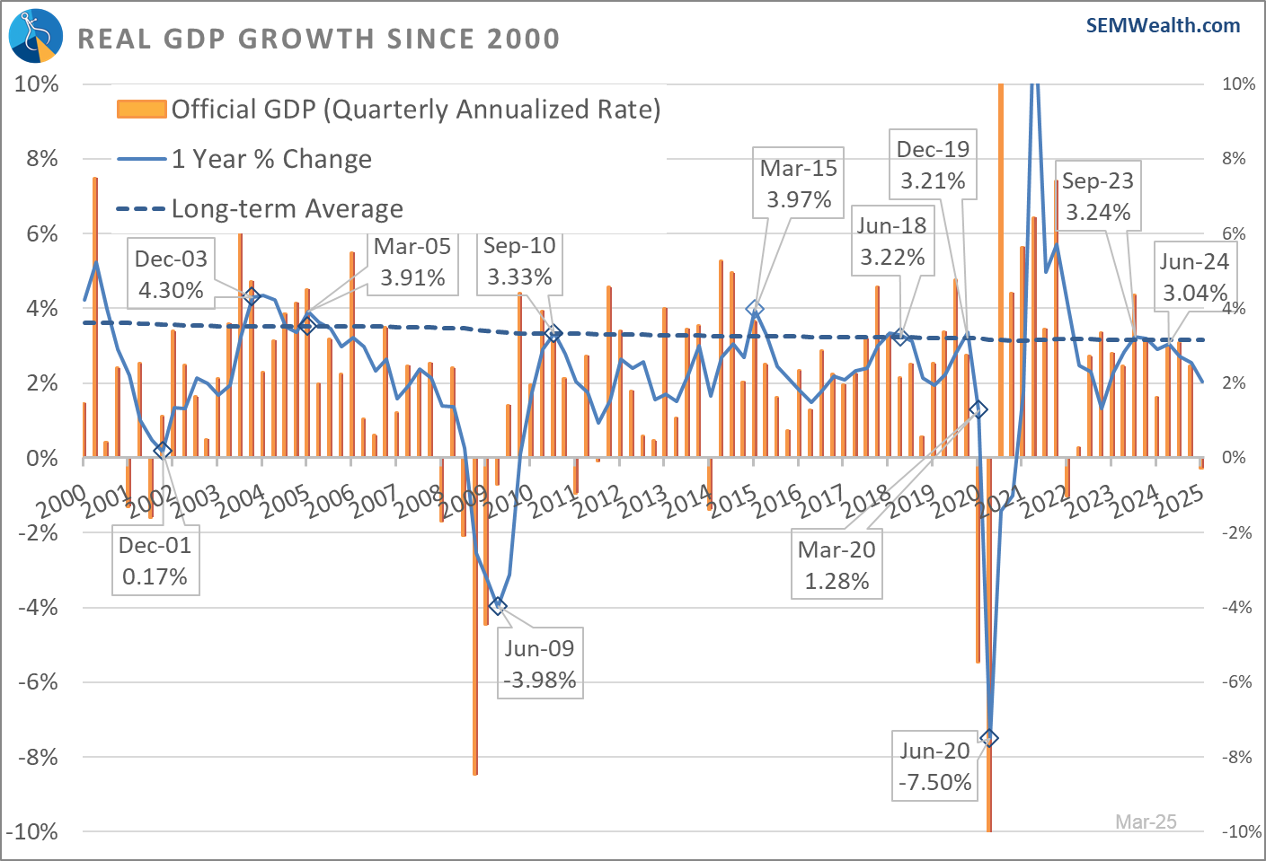 At SEM, we use the actual 12 month change in GDP as a more reliable indicator. That number shows GDP at 2%, which is below the long-term average of 3% and a significant slowing since the peak in September 2023, but not a recession. The 12 month number will typically be lower during a recession and will be matched with a LOSS in jobs, a decline in personal income, and a drop in spending.