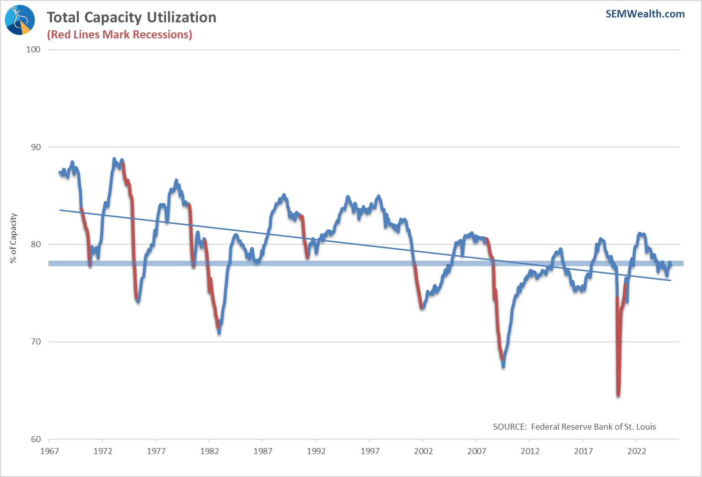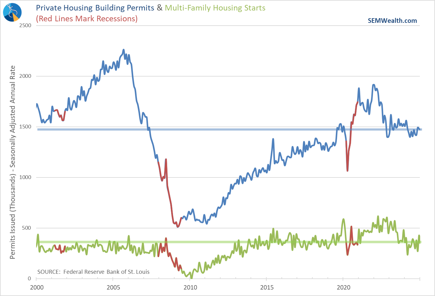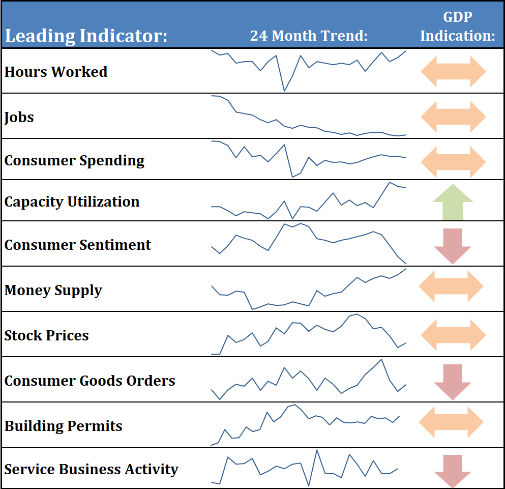 At SEM, we use the actual 12 month change in GDP as a more reliable indicator. That number shows GDP at 2%, which is below the long-term average of 3% and a significant slowing since the peak in September 2023, but not a recession. The 12 month number will typically be lower during a recession and will be matched with a LOSS in jobs, a decline in personal income, and a drop in spending.