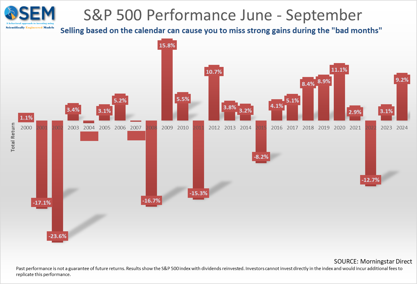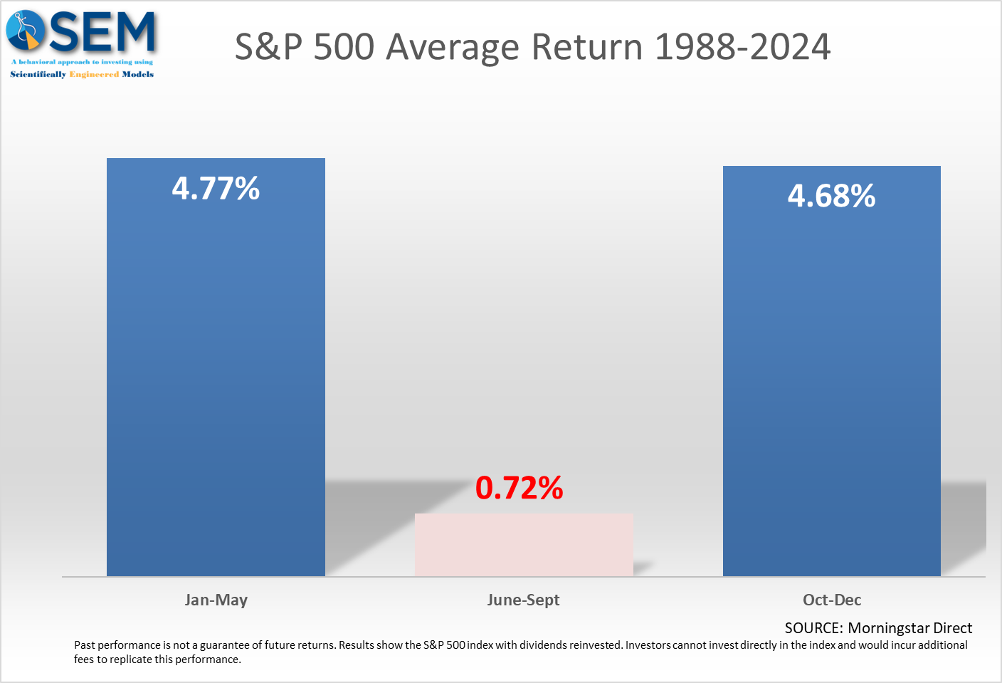 SEM does not follow any calendar or seasonal strategies such as "sell in May". We've found that those ideas typically get "arbitraged" out of the market as more and more people attempt to get ahead of other traders to take advantage of it.