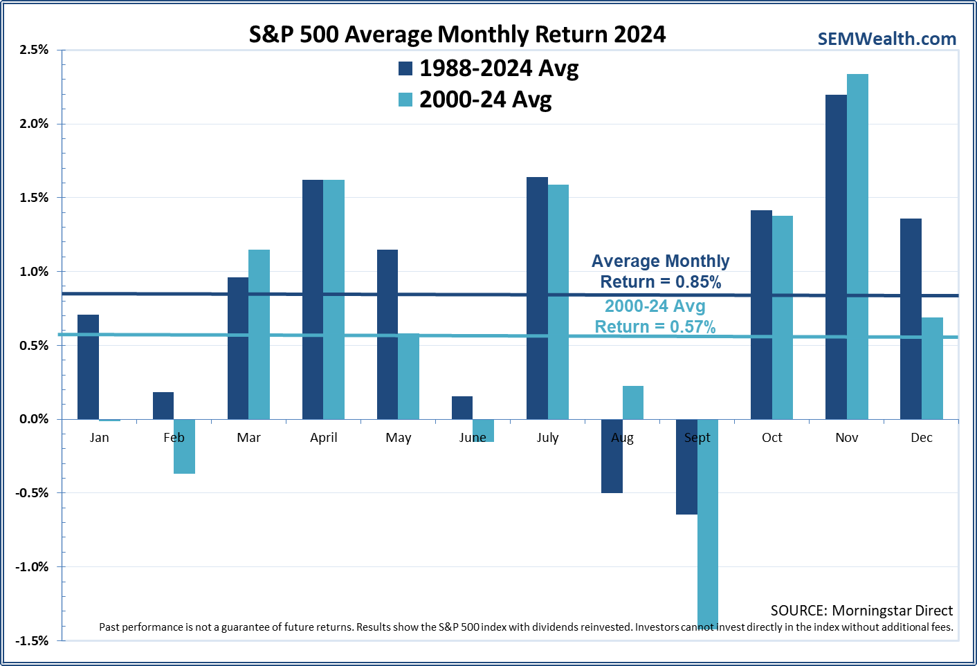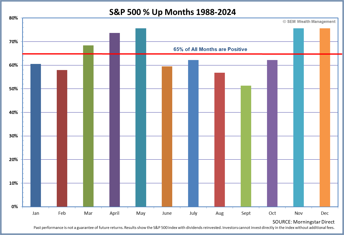 However, when you look at the monthly numbers you see a couple of things – first, the long-term data has not held up the last 25 years. Secondly, July tends to be a month where very strong returns may occur, so if you followed the "sell in May" strategy, you'd miss what could be a great month.