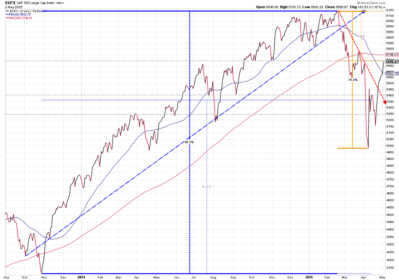 More importantly, the S&P 500 has blasted back through the "gaps" created from the "Liberation Day" sell-offs and broken back above the 50-day moving average. It is also nearly back to the 200-day moving average, a measure many people use as the long-term trend.