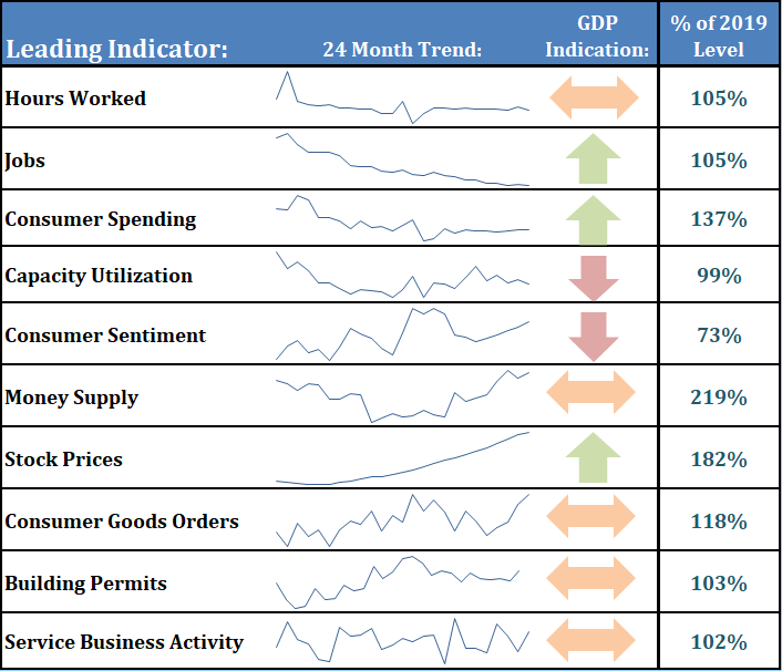All in our dashboard shows some improvement in the GDP Indication, but overall we have 3 indicators showing above average growth, 2 showing below average growth and the rest just meandering around a 2.25 - 2.5% growth rate economy. That's not 'bad', but it's also not anything to get excited about.