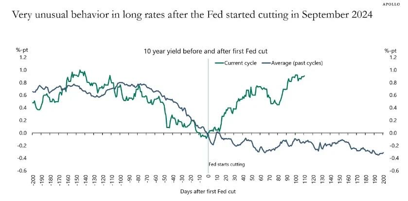 This chart from Bloomberg shows how the 10-year bond normally reacts (the blue line) to the Fed's rate cuts. The green line shows what has happened this time.