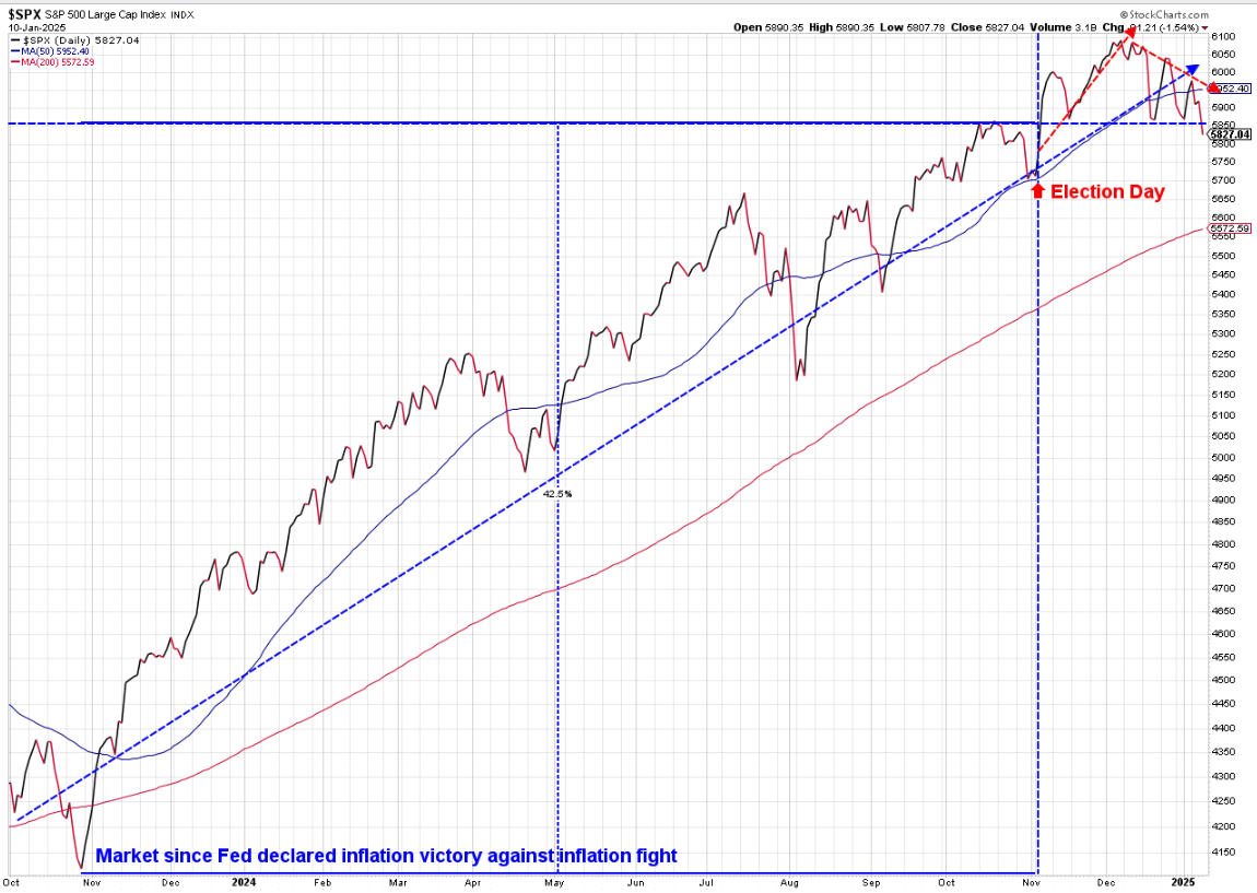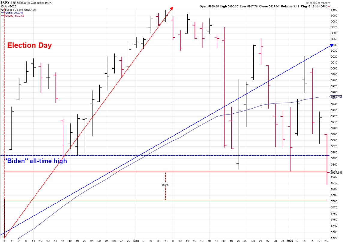 This will continue to be the chart of the year. We will see what emerges this week, the final week before President Trump takes office. Stocks are now below the opening price the day after the election and up less than 1% since election day.