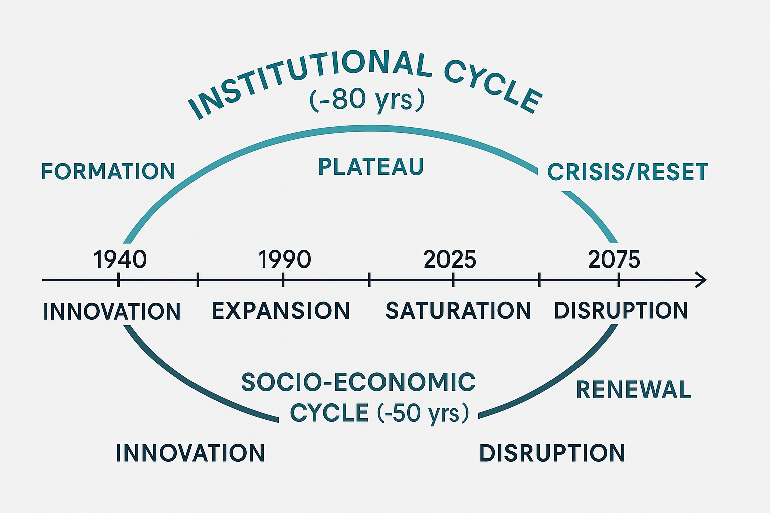 - Socio-Economic Cycle (~50 yrs) – Arches below the timeline. Follows the pattern of Innovation → Expansion → Saturation → Disruption → Renewal.