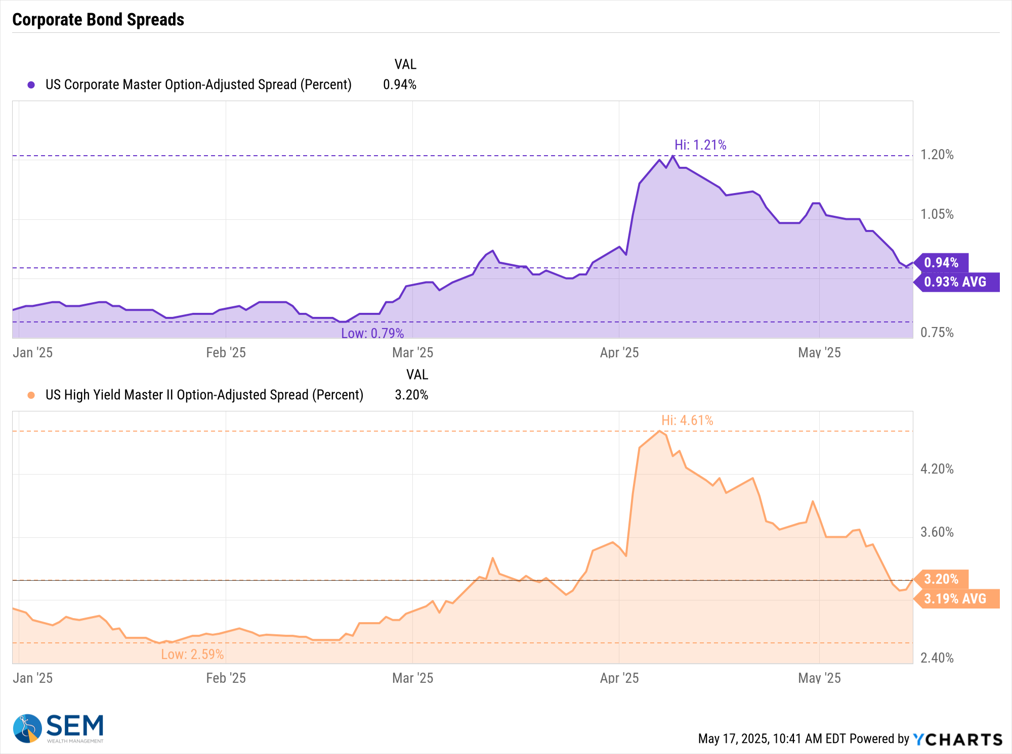 More importantly, credit spreads after spiking in April have come back down near the lows of the last 5 years. It's one thing to have Treasury yields spike, but another to see problems with credit rising to the top of everyone's minds.
