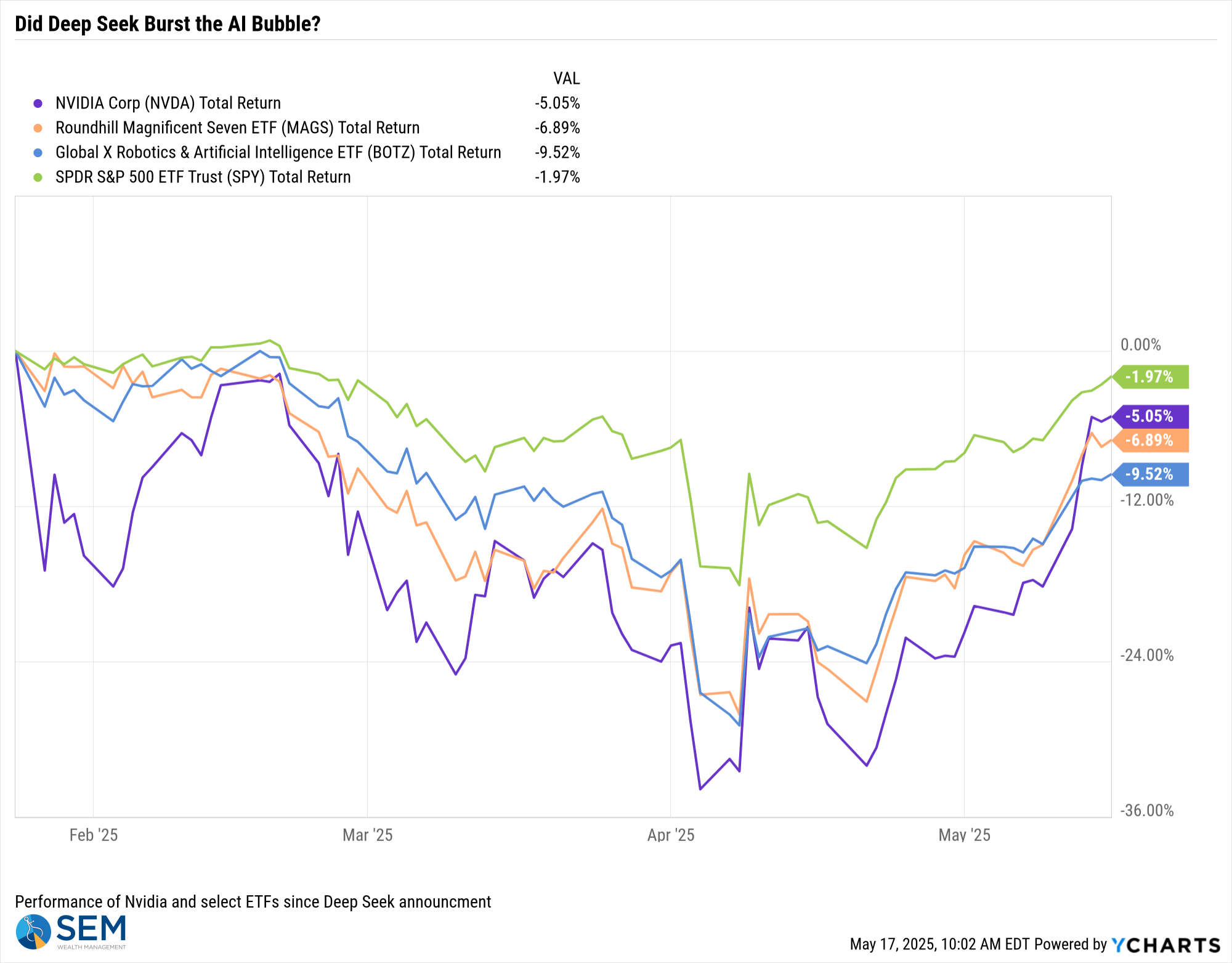 Here's an updated chart I made tracking these market leaders since the "Deep Seek" announcement. At least for now, it appears that bubble has reinflated. I may have to relabel this chart if the rally keeps going.