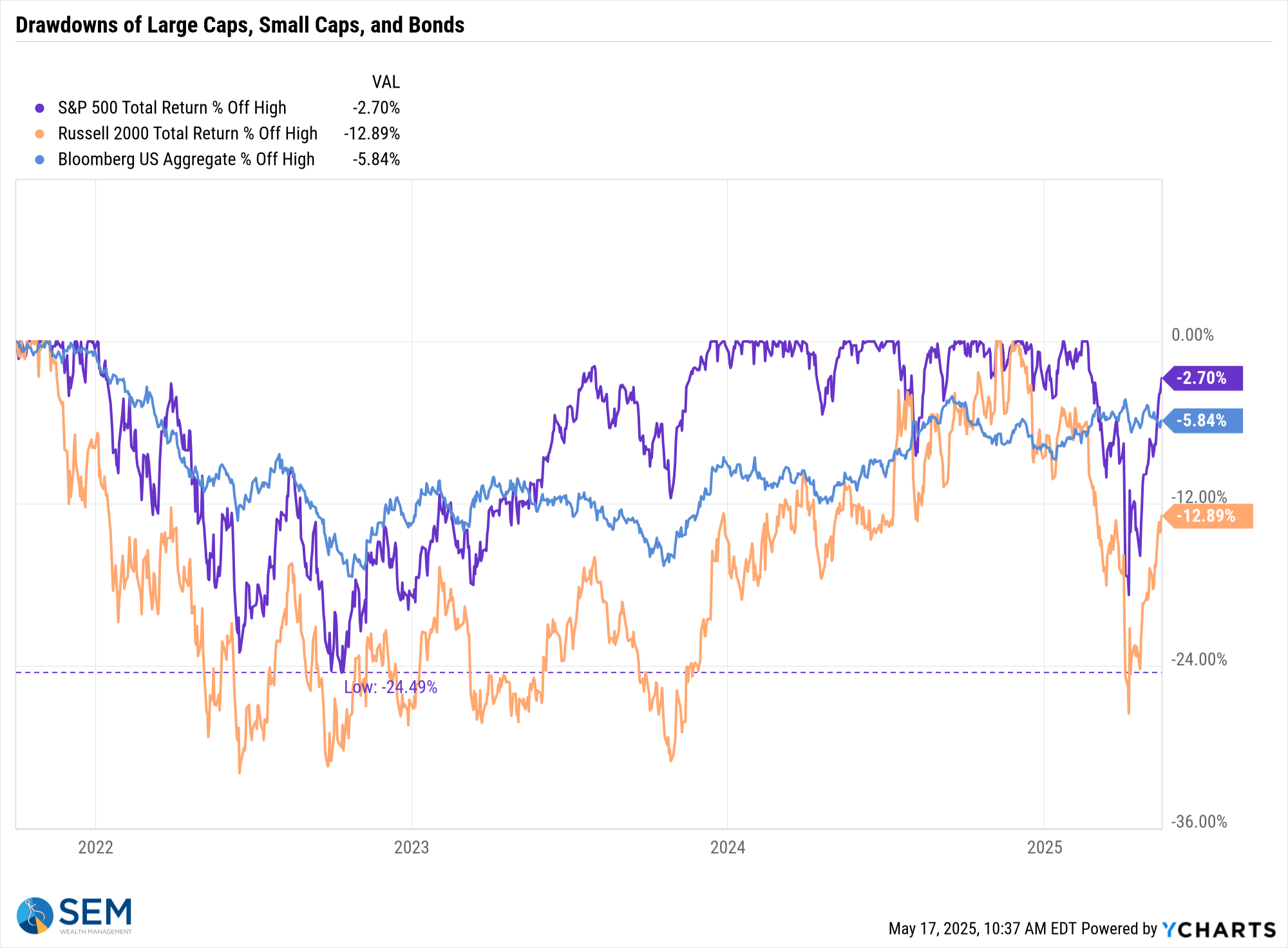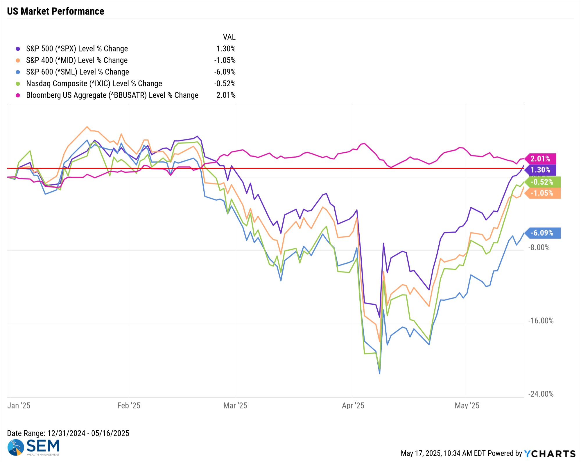 Overall, the S&P 500 has returned to positive territory for the year, while the NASDAQ is inching its way to the black. Small caps continue to disappoint.