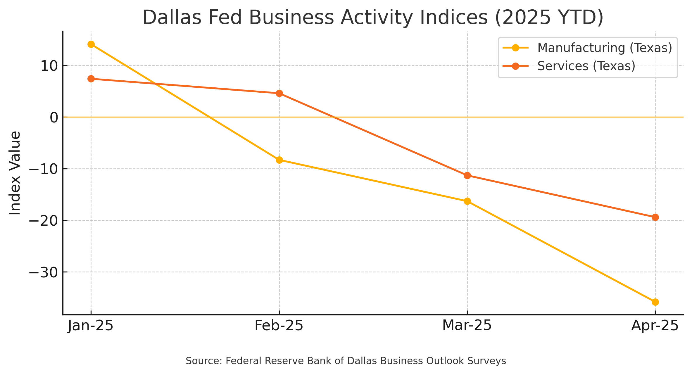 Just days before 10-year Treasury yields began their 36 basis point spike from 4.17% to a high of 4.53%,, Mauldin dissected a shift few people were talking about—the collapse in the Dallas Fed Business Outlook surveys. Manufacturing’s headline activity index cratered to –35.8, a level we hadn’t seen since the COVID shutdown, and services followed to –19.4. What caught his eye were the free-text comments: “Orders went to zero overnight,” “Customers won’t sign until tariff numbers settle,” and “We lost 64 % of container bookings in a week.”