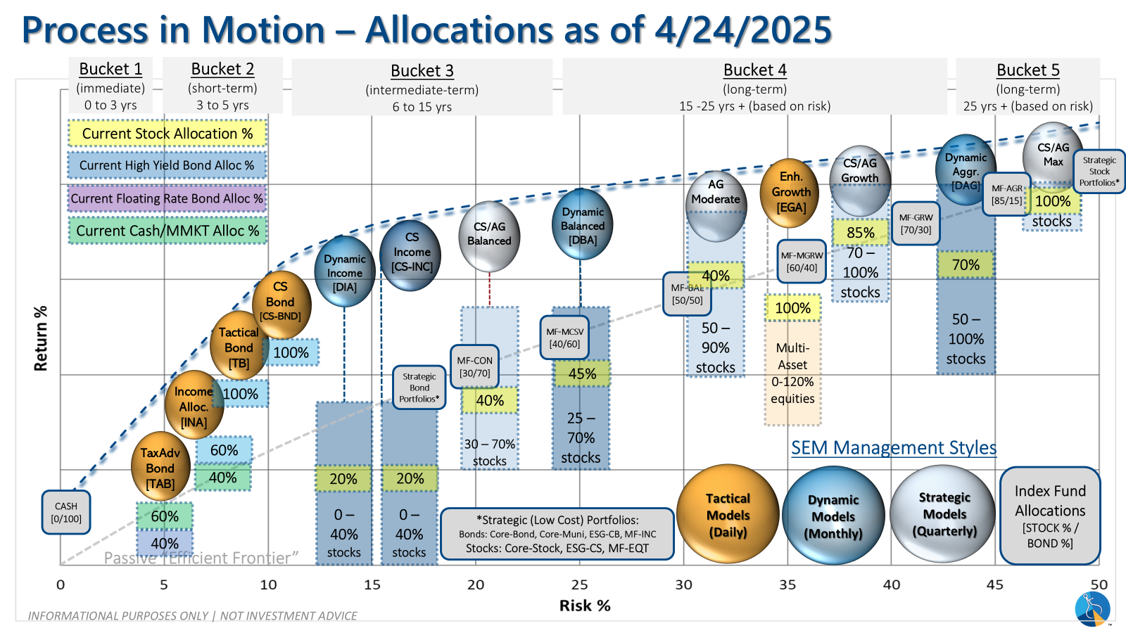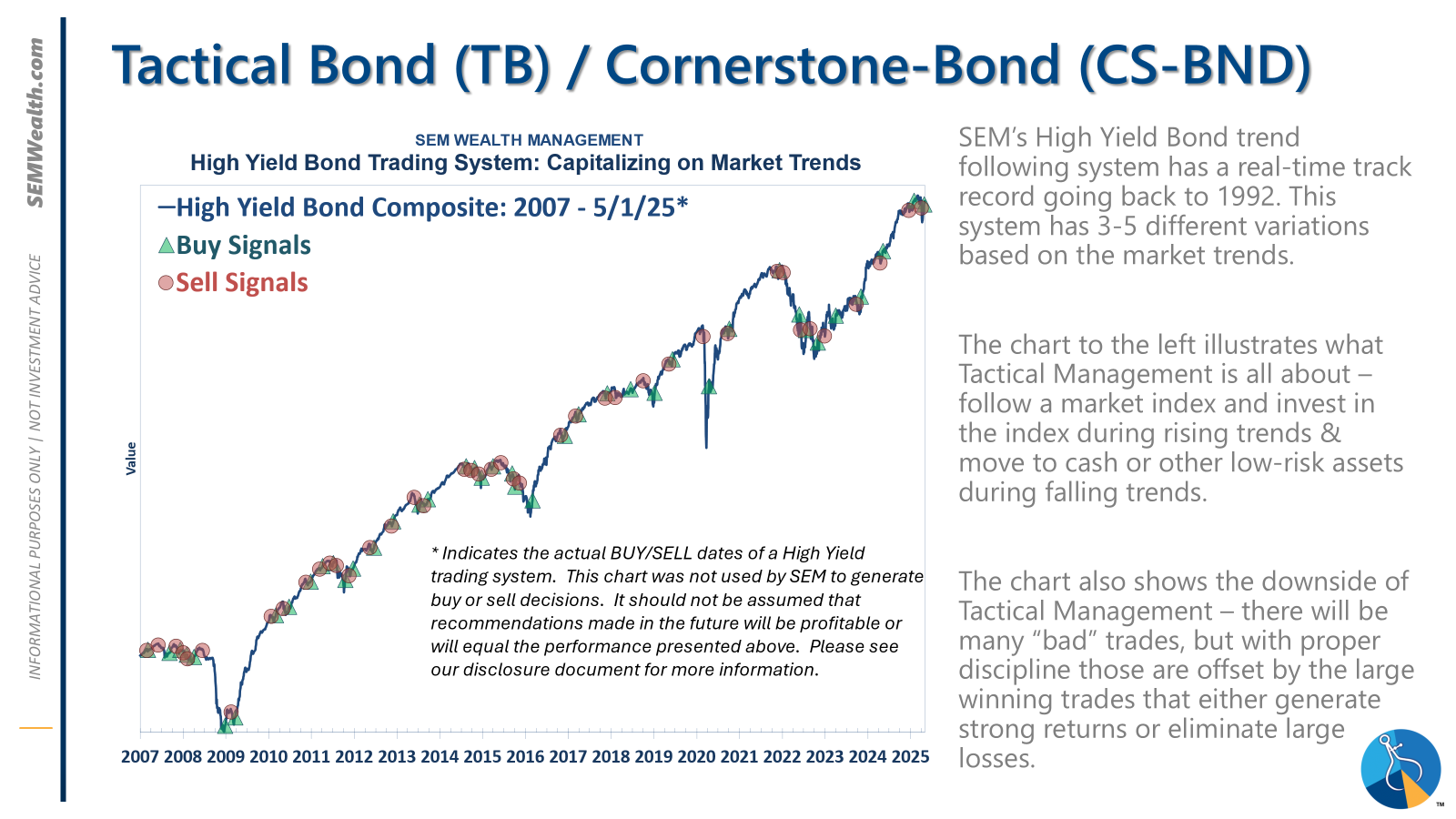 -Tactical High Yield sold high yield bonds on 4/3/25 after 9 weeks in these funds. These models bought back in on 4/24. All proceeds were moved to money market or short-term bonds, with a yield around 4.1% in money markets.