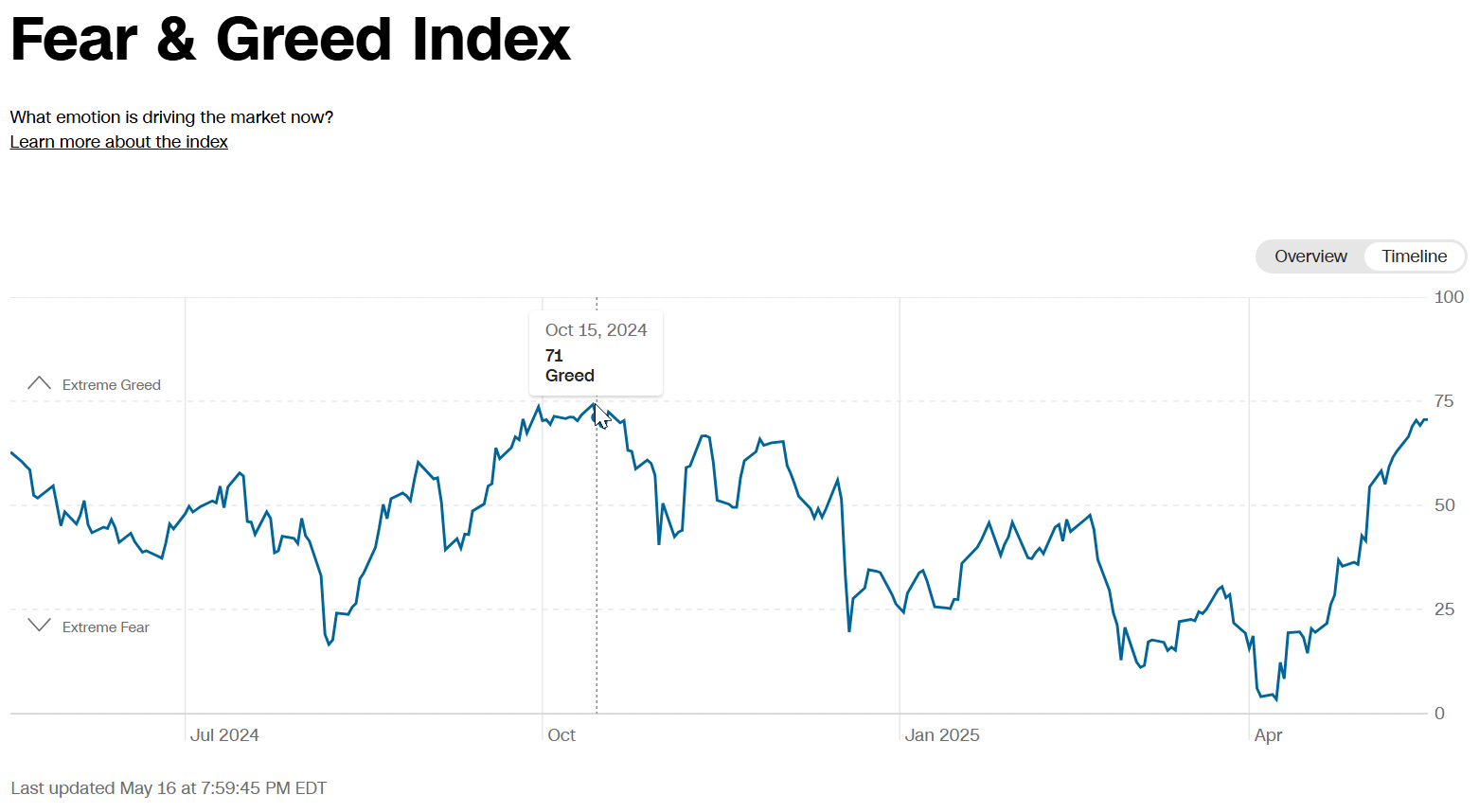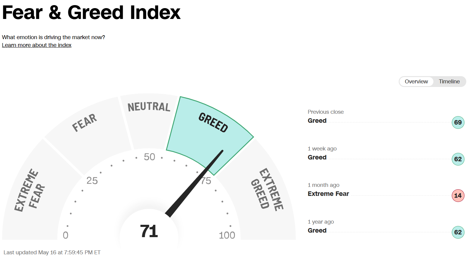 It's amazing how quickly sentiment turned in April. According to the CNN Fear & Greed Index, we went from "fear" to "greed" in less than one month.