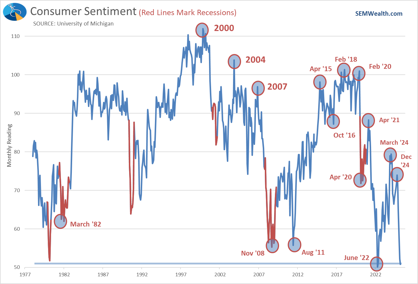 Consumers also are clearly not happy, with what has been happening, even with the rollback of most of the tariffs. We are rapidly approaching the lows of 2022 in terms of sentiment. Most of us remember the lows of 2022 led to two consecutive declines in GDP and a drop of just over 20% for the stock market. I'm not saying that is what comes next, but a deeply pessimistic consumer does not often lead to record S&P 500 profits, which is what is currently expected.