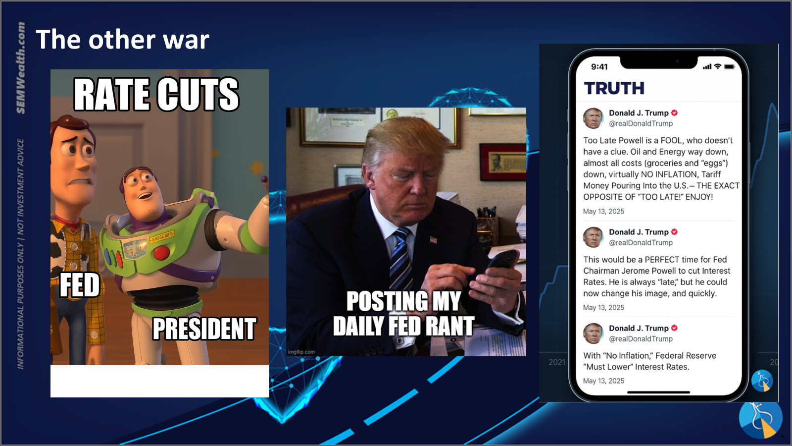 At the same time we saw the on-going (one-sided) feud between Donald Trump and Jerome Powell. I used this slide during an advisor meeting this week and it is something that could boil up and be a net negative for the market.