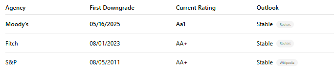 Moody’s cut the U.S. sovereign rating to Aa1 from Aaa after Friday’s close (05/16/2025), citing (1) persistent, large fiscal deficits, (2) a debt burden now topping $36 trillion and projected to 134 % of GDP by 2035, and (3) political gridlock that makes any multi-year fix “unlikely.” The outlook was set to stable, but the move closes the chapter on America’s century-long run of triple-A status across all three major agencies.