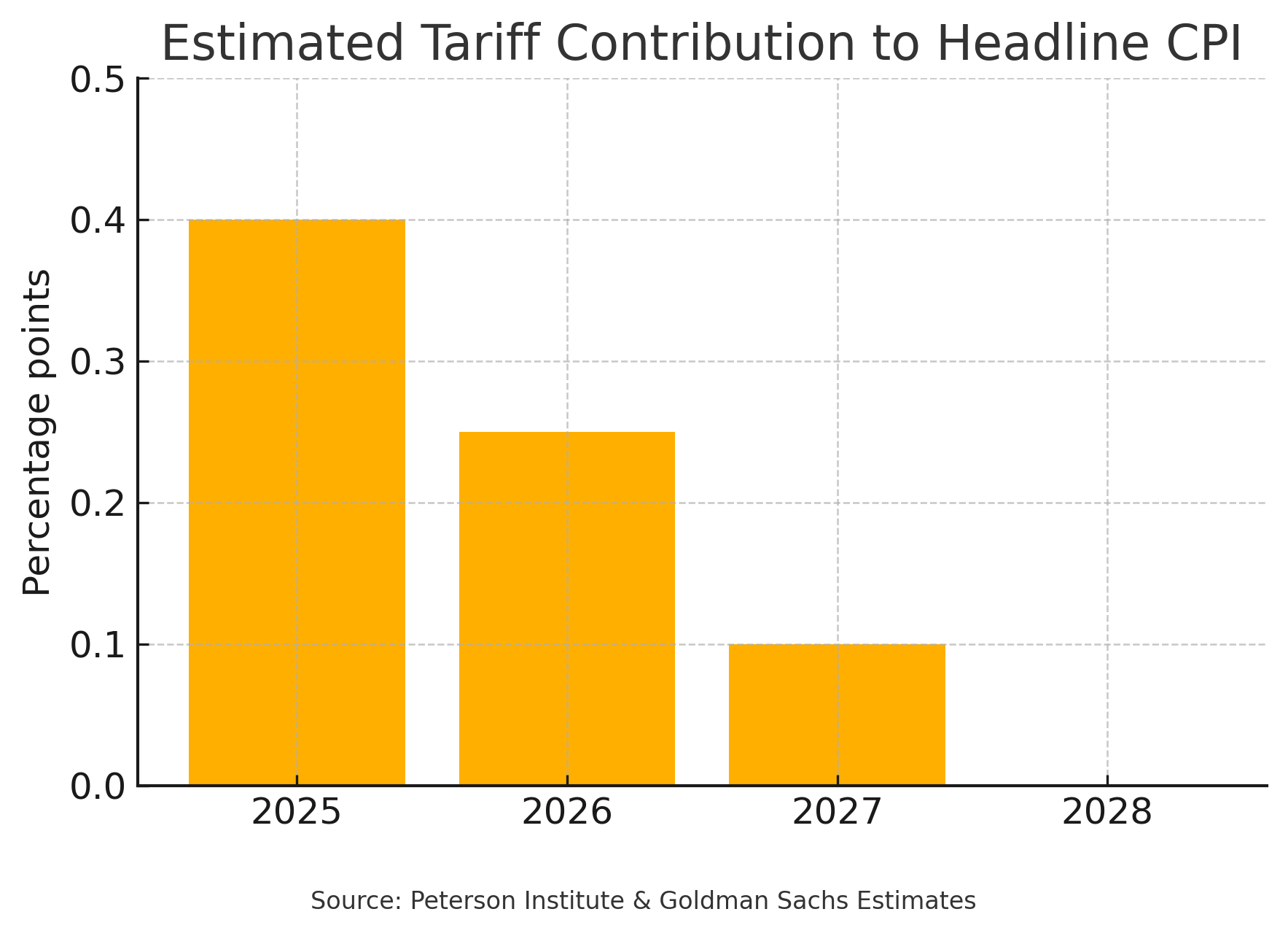 He quantifies the hit using outside work from Peterson and Goldman: the tariff schedule alone could tack +0.40 percentage-points onto headline CPI in 2025—and +0.25 pp in 2026—before fading. That may not sound like much, but it’s roughly the entire gap between 2 % and the Fed’s comfort ceiling. In other words, tariffs could be what keeps Jerome Powell from cutting rates even if growth stalls.