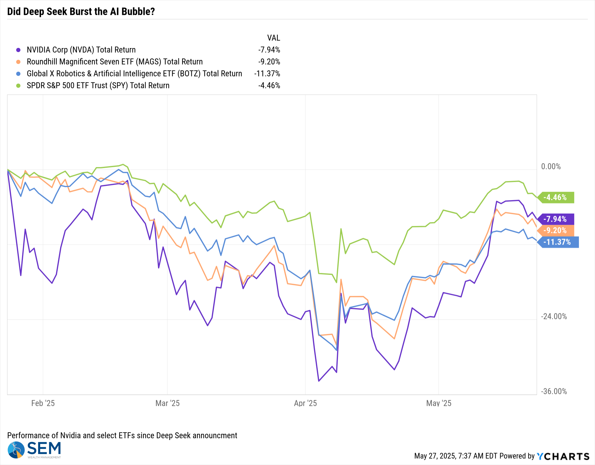 - Takeaway: AI remains the market’s security blanket – strong revenue and earnings growth CAN justify the high valuations, but they have to continue to perform at a high level. The AI stocks have nearly recovered their losses since the "Deep Seek" announcement in January. Nvidia's earnings could determine whether the rally continues.
