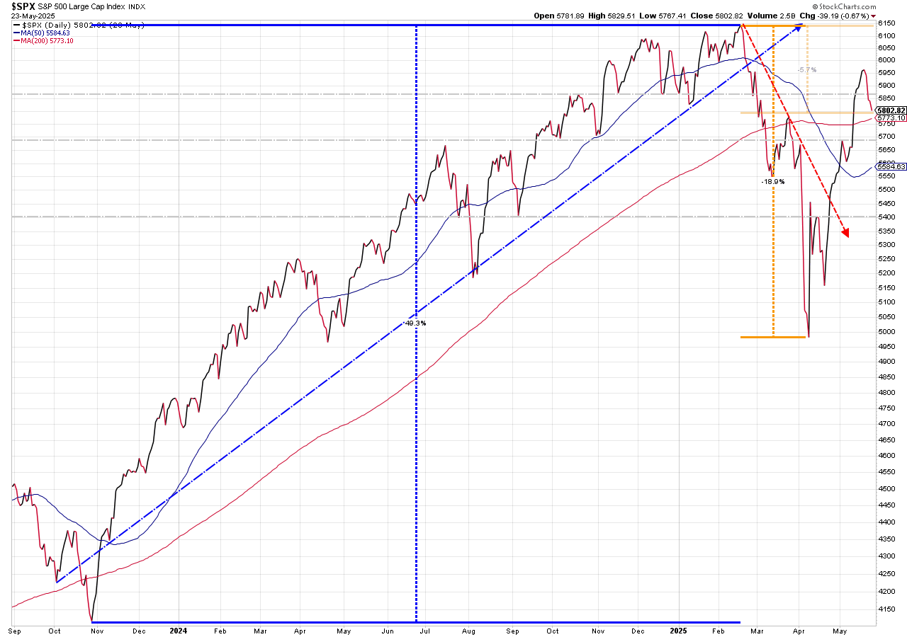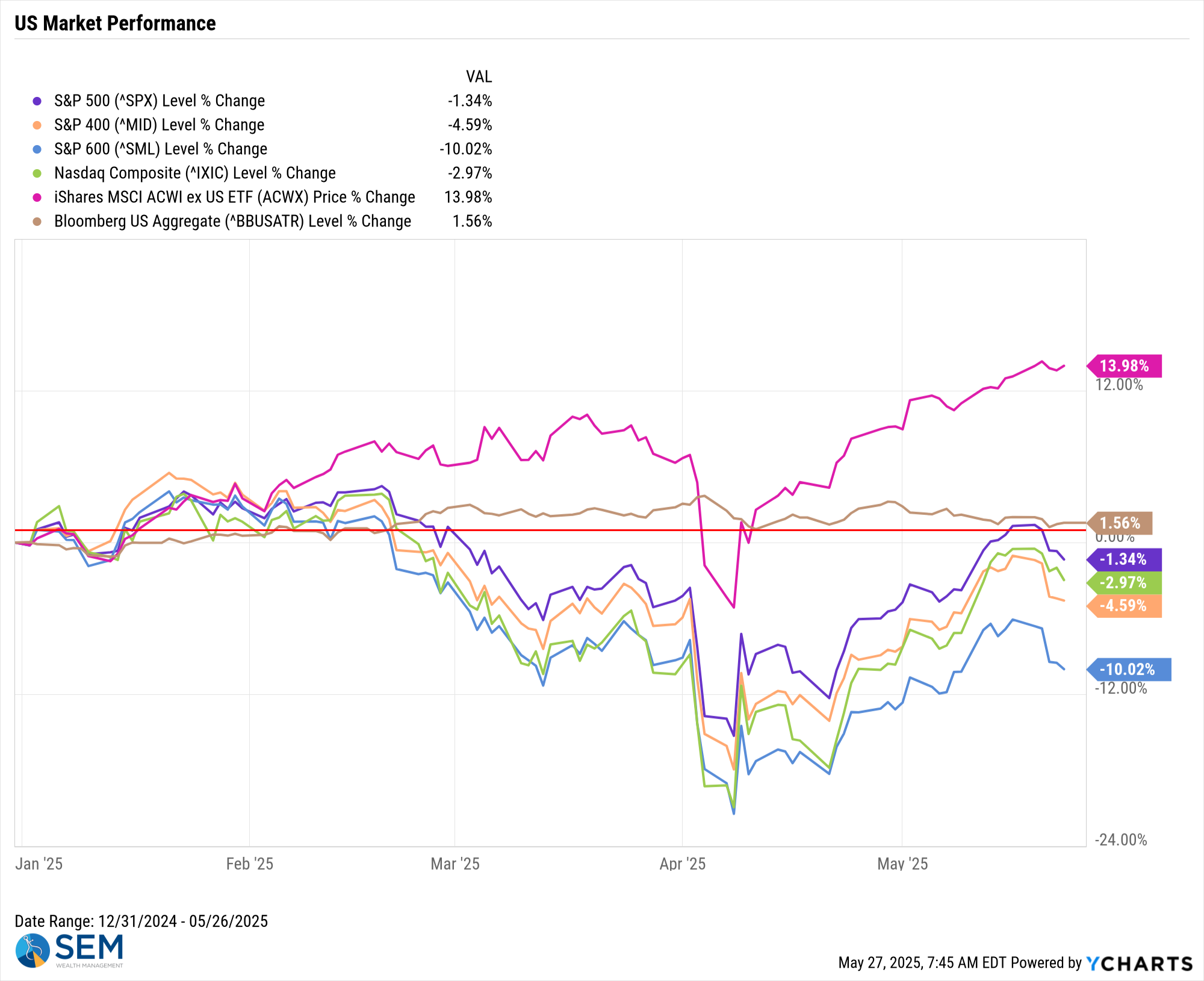 - Friday shock: Markets opened Friday to President Trump floating a straight 50 % tariff on all EU goods, knocking the European markets down -1.5 % and pushing the US markets even further into the red for the week (the S&P 500 gave up nearly 3% for the week). Note the President also threatened a tariff of 25% on smart phones made outside the US.