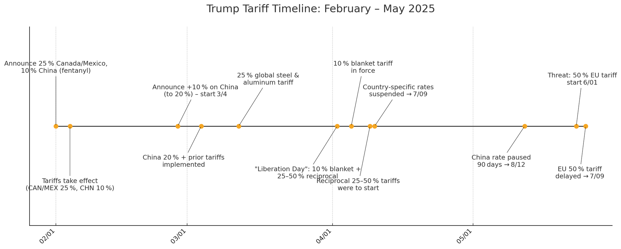 - Takeaway: This could again be a "negotiating tactic" like we saw with the bulk of the "liberation day" tariffs". While not a full timeline, this shows the whipsaws we've already seen from the Trump Administration on tariffs.